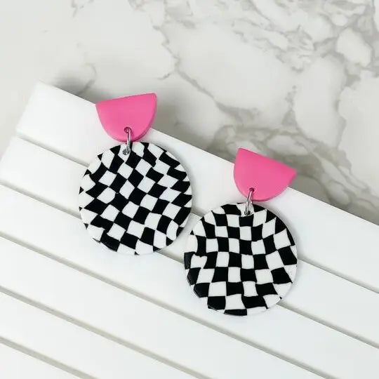 Step out in style with the Black, White & Pink Geometric Clay Dangles. Measuring 2.25" in length, these dangle earrings are both lead and nickel compliant, ensuring your comfort and safety. The striking geometric design in bold black, white, and pink hues adds a pop of color and a touch of sophistication to any outfit.