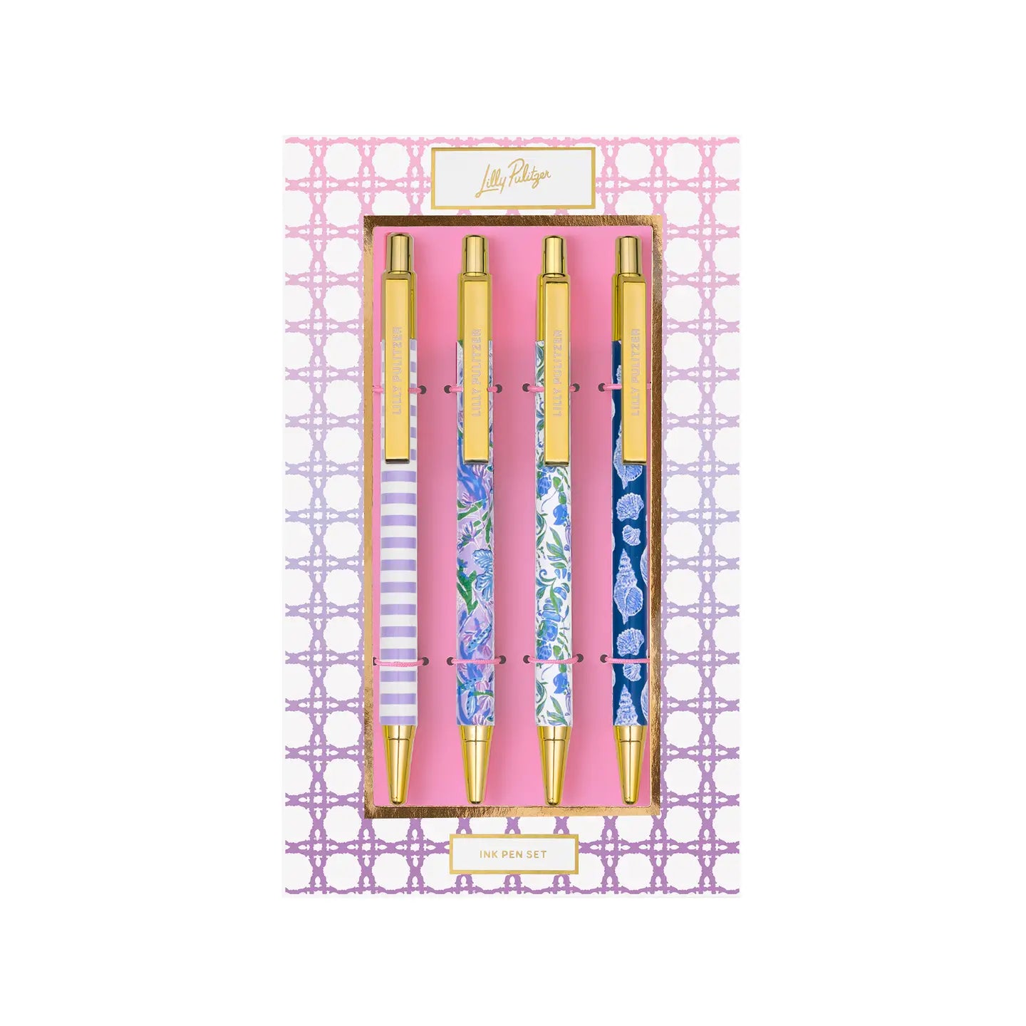 Write in style with the Lilly Pulitzer Colored Ink Pen Set, where vibrant design meets smooth performance. This set of four black ink ballpoint pens features chic gold accents and colorful Lilly Pulitzer patterns, adding a playful yet polished touch to your desk, planner, or tote.