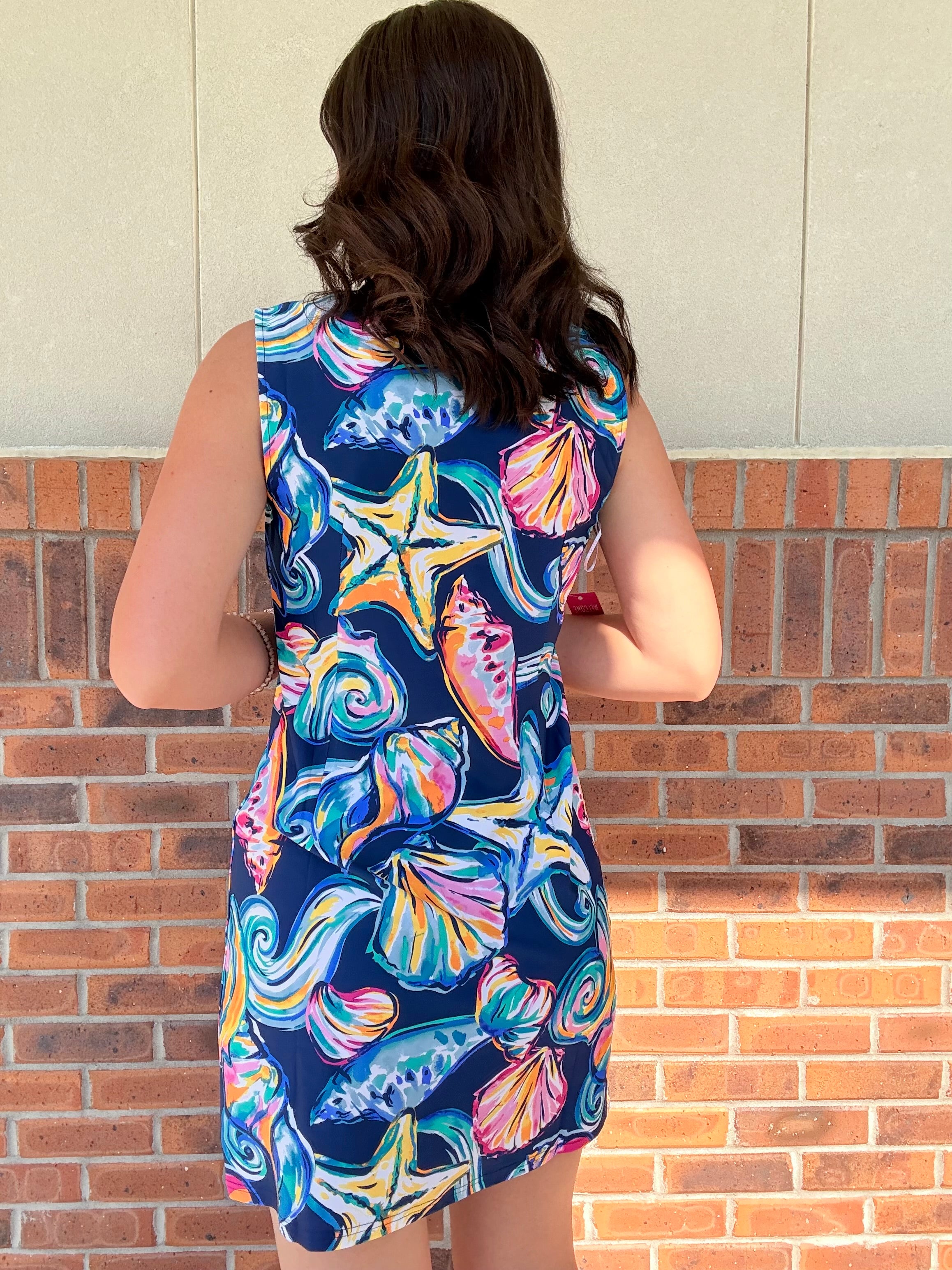 Effortless coastal elegance meets playful seaside charm in this sleeveless shift dress. The vibrant seashell print features multicolor starfish, shells, and wave motifs dancing across a navy base—perfect for capturing that breezy beach-to-brunch vibe. The split neckline adds a modern touch while the above-knee cut keeps things light and comfortable. Slip it on for casual outings, resort wear, or any occasion calling for a splash of nautical flair.