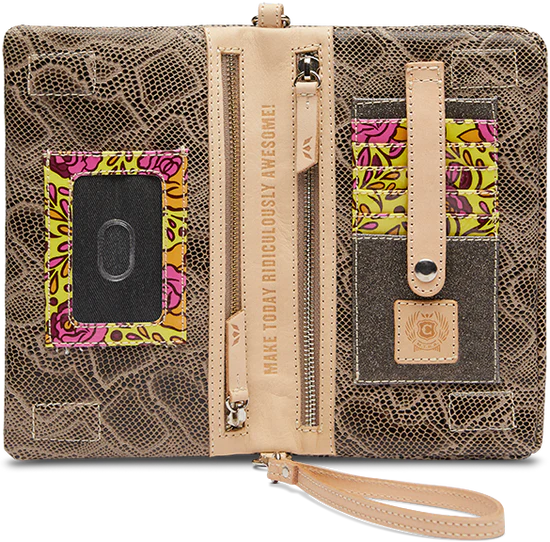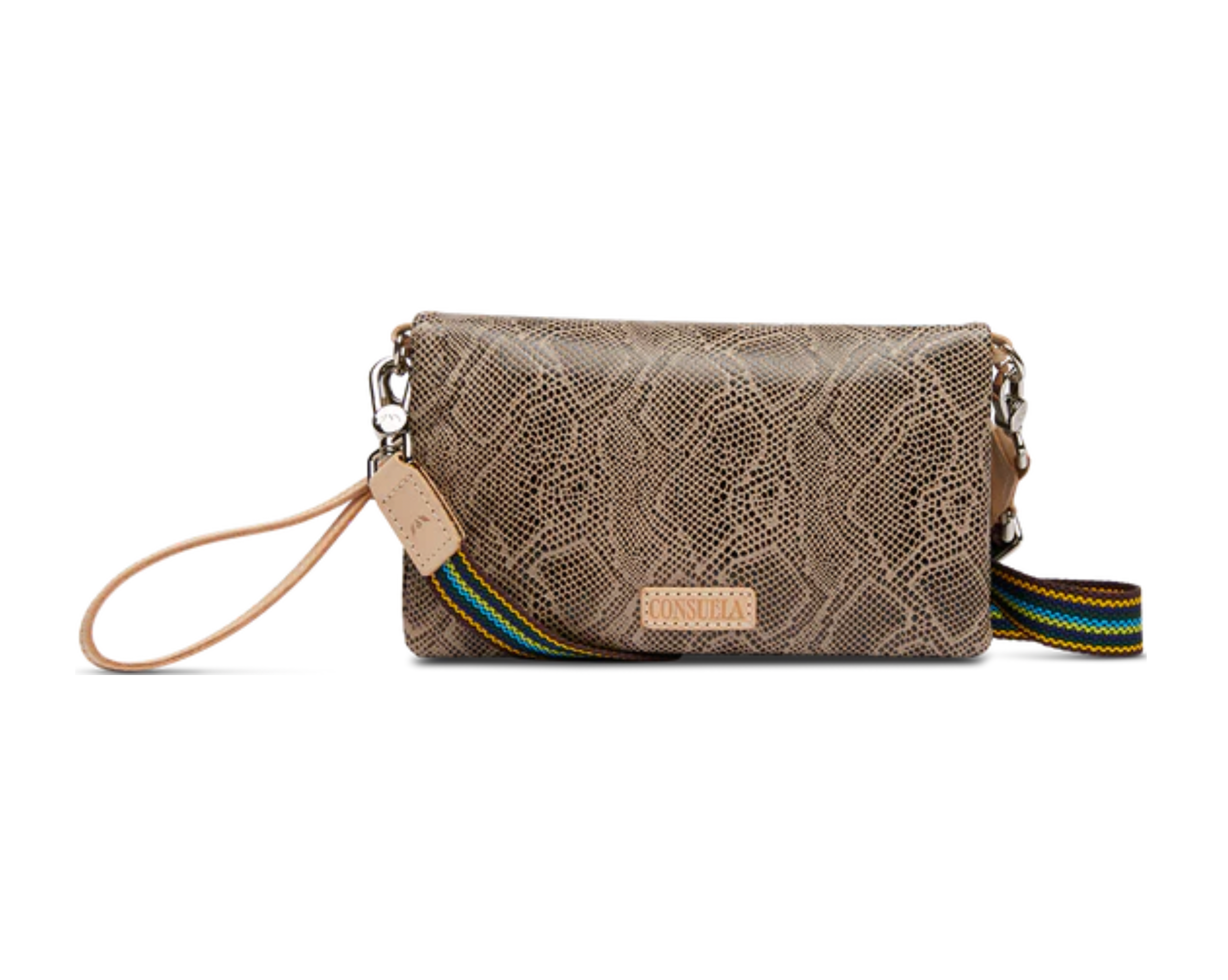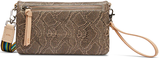 - Included detachable wristlet strap and adjustable woven crossbody strap