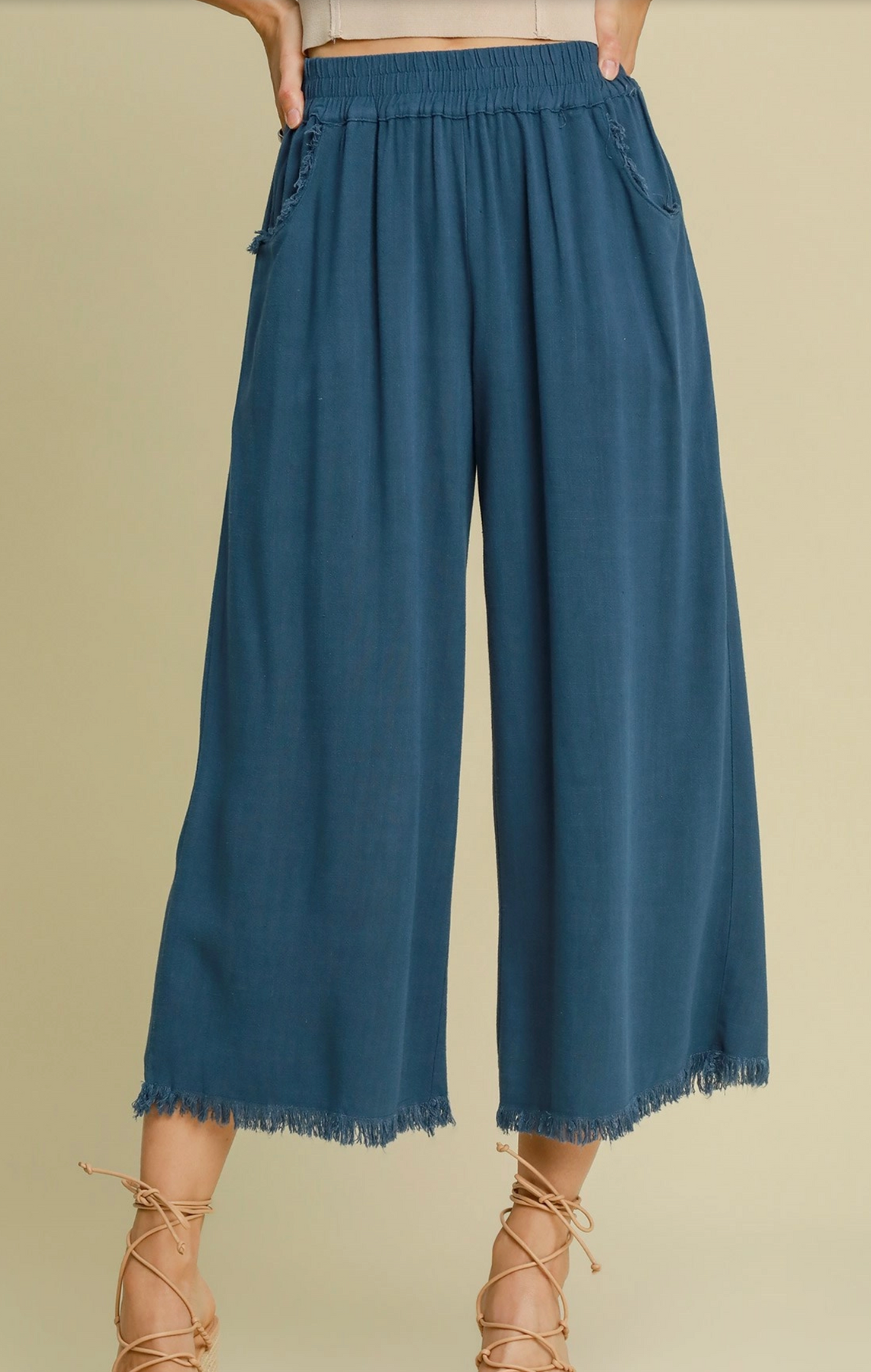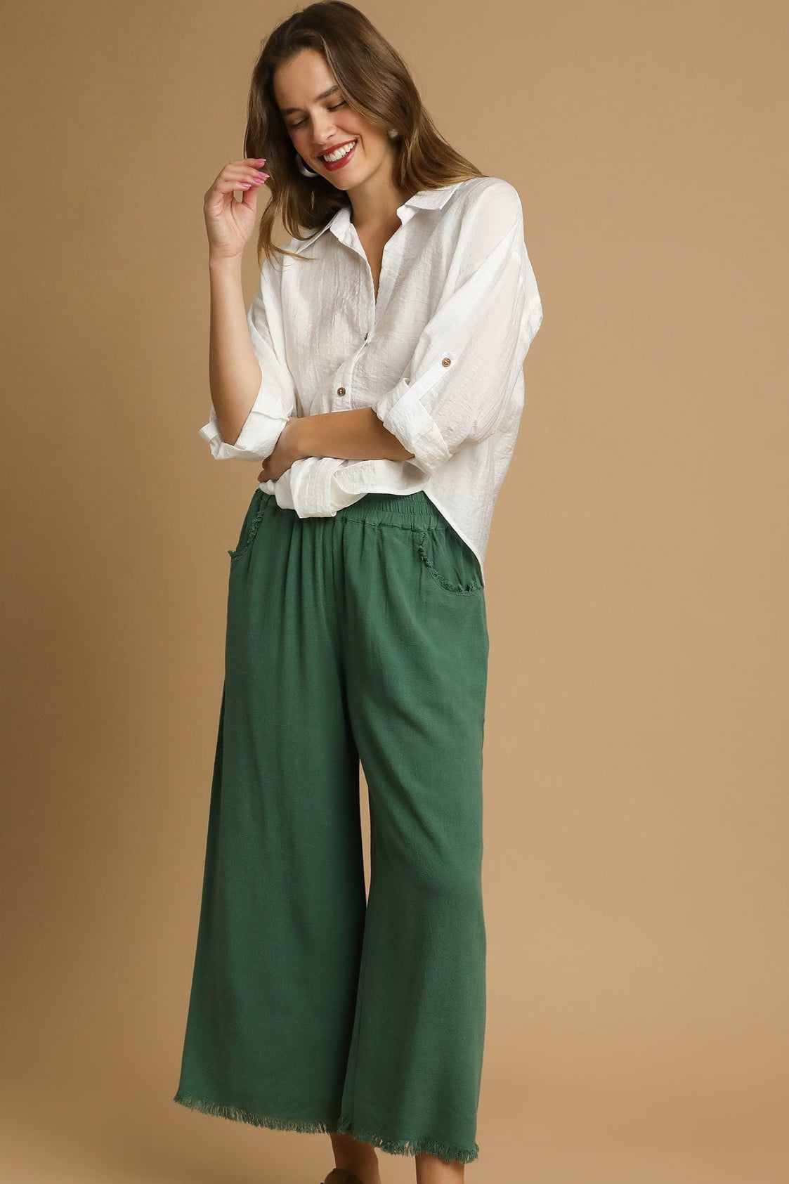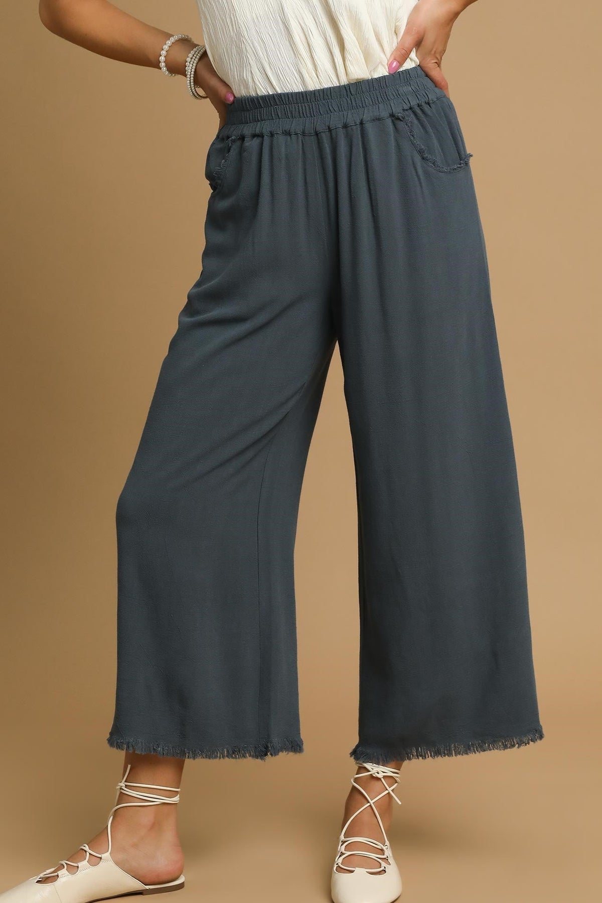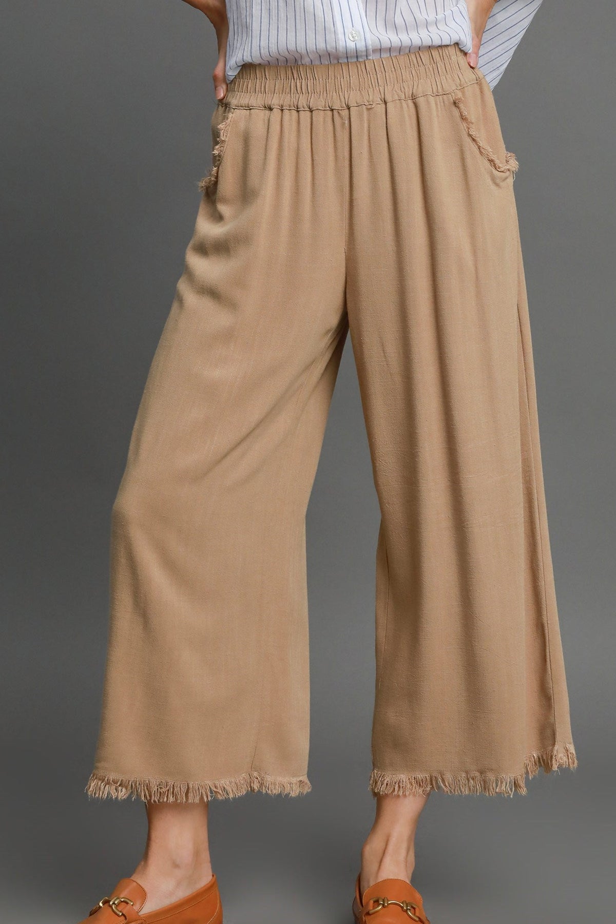 Stay cool and stylish with Umgee's Linen Wide Leg Pants. Made with a comfortable linen blend, these pants feature an elastic waistband and side pockets for added convenience. The frayed hem adds a touch of uniqueness to these best-selling pants. Perfect for a laid-back, effortless look.