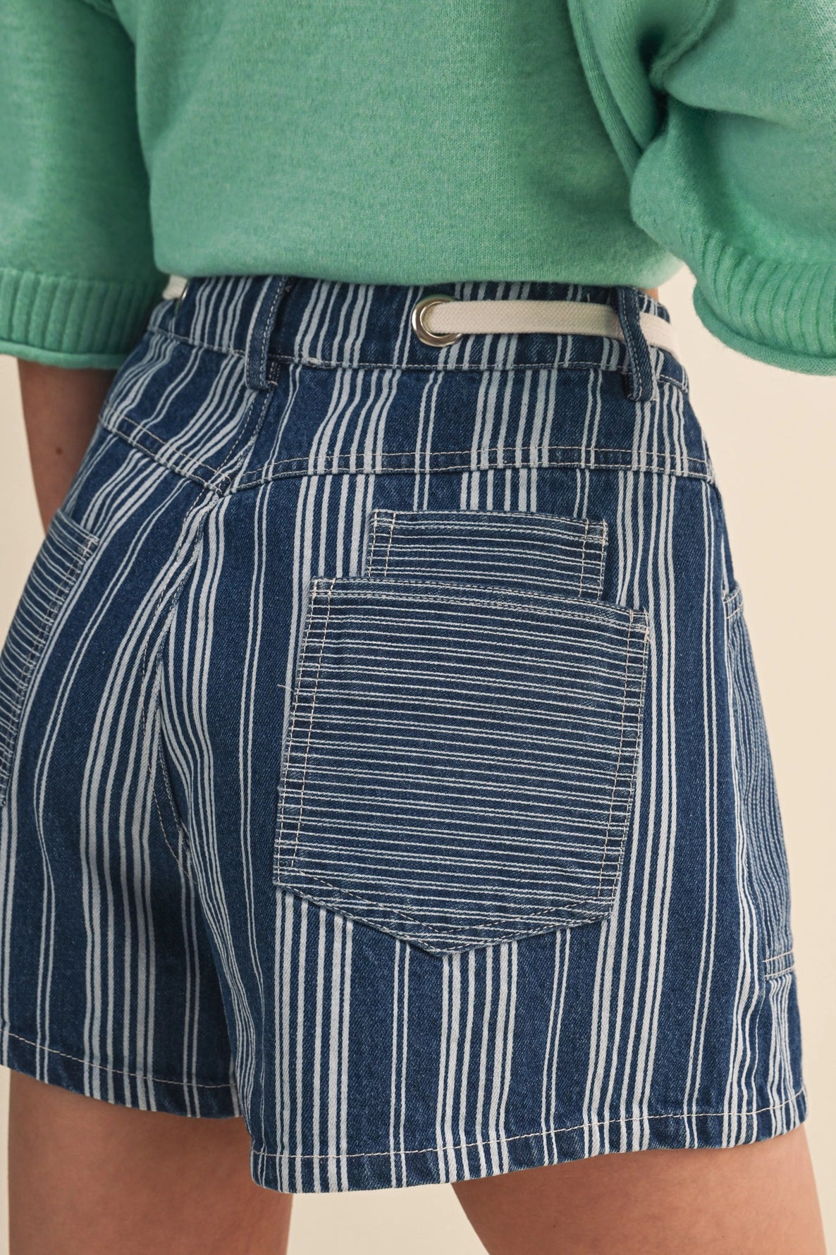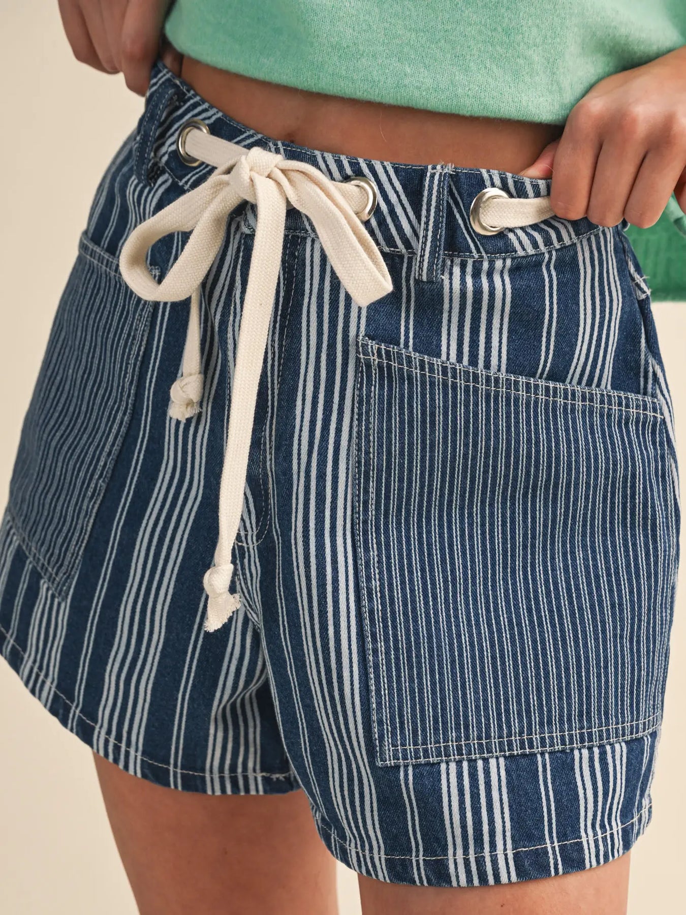 Strut your stuff in these playful mixed-stripe denim shorts that blend retro vibes with modern edge. The high-rise fit flatters your silhouette while the drawstring waistband with chunky grommets adds a fun, statement-making detail. Oversized pockets keep your essentials close without the bulk. Perfect for dancing through your day—whether you're hitting the town or keeping it casual.
