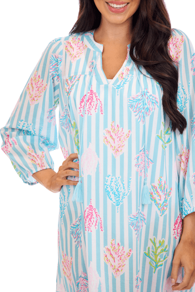 The Pearla Coverup is a stylish and versatile addition to your beachwear collection. Crafted from lightweight cotton voile, this cover-up offers a breezy and comfortable fit, perfect for warm, sunny days. It showcases beautiful coastal prints that evoke a sense of seaside charm, while the contrast hem binding adds a touch of elegance. The V-neck design is complemented by braided tassel ties, allowing you to adjust the neckline to your preference. With a length of approximately 33 inches from shoulder to hem on a size small, it provides just the right amount of coverage. Available in three sizes—small, medium, and large—this cover-up is made from 100% cotton, ensuring breathability and softness against your skin. Whether you're lounging by the pool or strolling along the shore, the Pearla Coverup is the perfect blend of comfort and style.