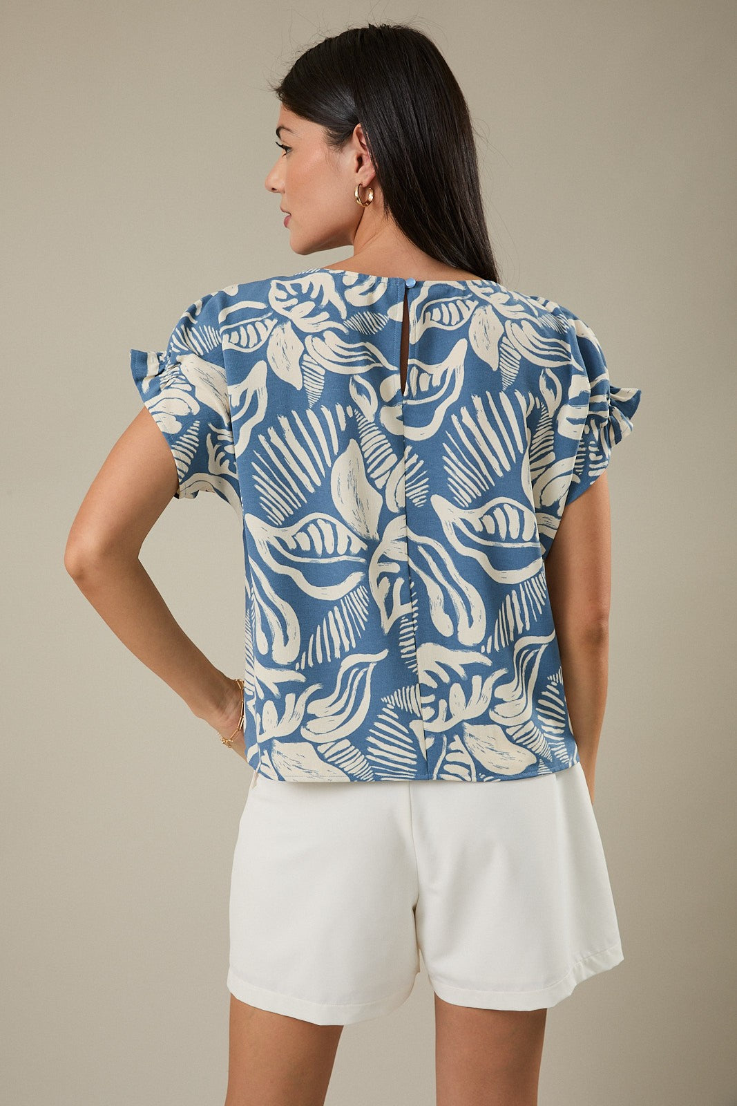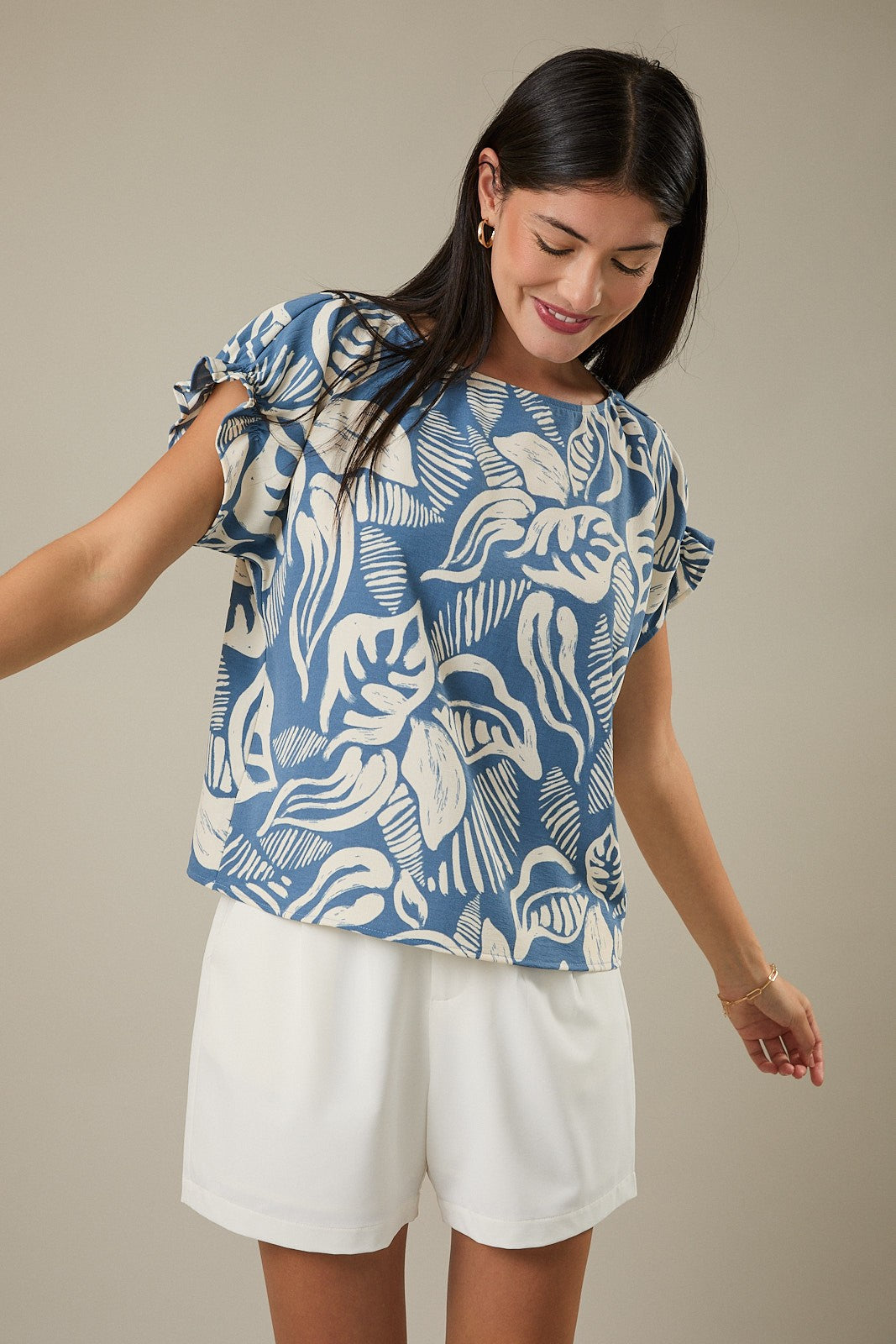 Elevate your everyday style with this charming round neck top, featuring delicate ruffle puff sleeves and an eye-catching leaf print. The relaxed short sleeve design offers comfort and breathability, perfect for casual outings or layering. The ruffled neckline and sleeve details add a touch of feminine elegance, making this versatile piece a must-have for spring and summer wardrobes. Pair it with your favorite jeans, shorts, or skirts for an effortlessly chic look.