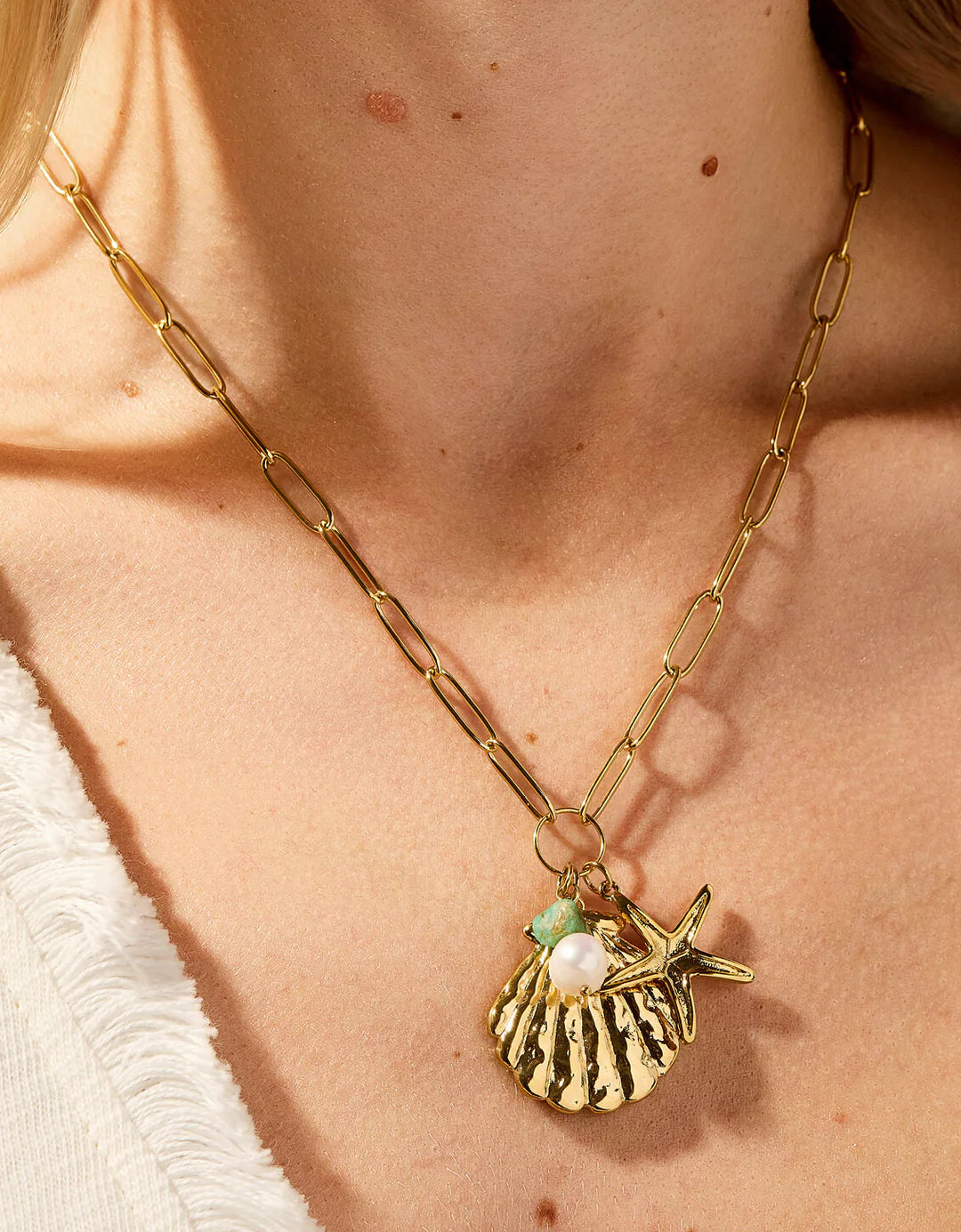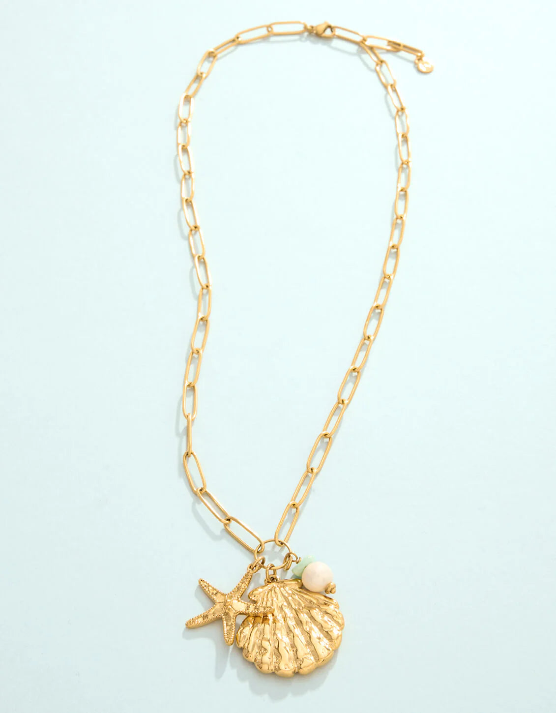 Drift into coastal charm with our Islanders Beach Necklace. Inspired by the treasures found along the shoreline, this necklace carries a large scalloped shell, a skinny starfish, and a freshwater pearl topped with a natural sea foam glass bead on a paperclip chain. Designed to shine through everyday wear, exercise, showers, and a summer at the beach in tarnish free 14kt shiny gold plating over stainless steel.