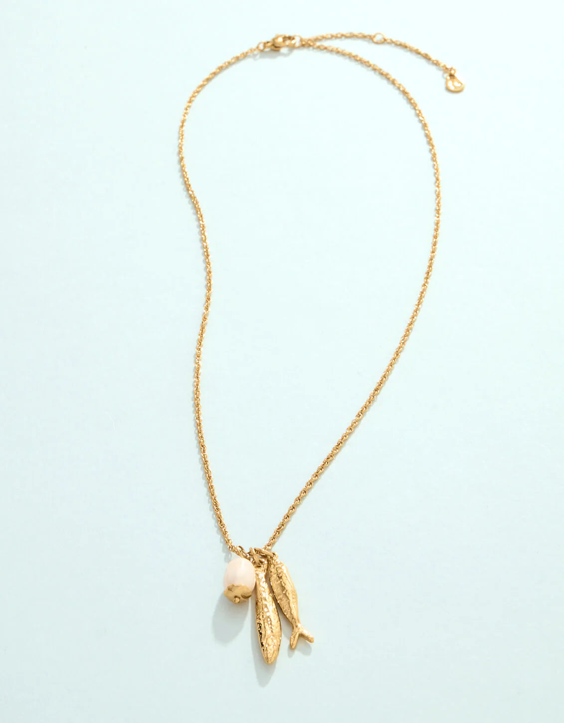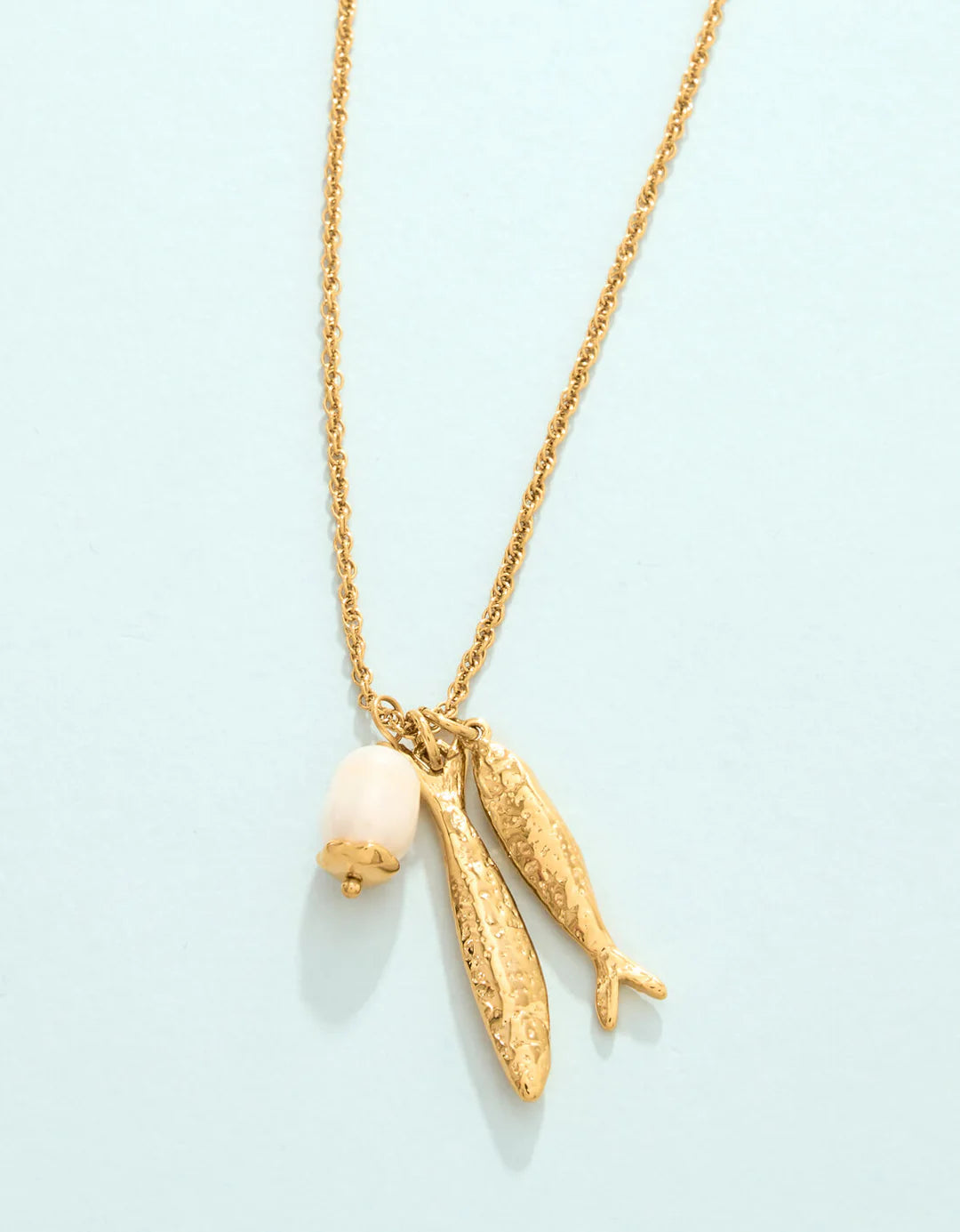 Make a splash this summer with our Sardines Necklace. Plated in 14kt shiny gold over stainless steel, this necklace features 2 softly textured sardine charms and a gleaming freshwater pearl. This is a necklace you will never want to take off, designed to shine through everyday wear, exercise, showers, and a summer at the beach.