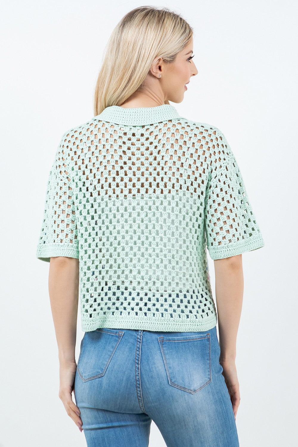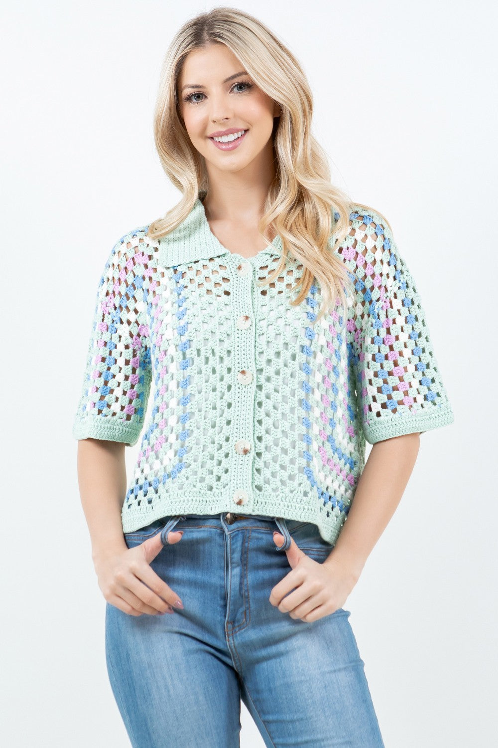 Mix-and-match style meets effortless charm with this color block mesh top. Featuring a crisp button-down front and structured collar, it's ready for layering or wearing solo. The delicate crochet-inspired texture adds a touch of handmade whimsy to your everyday rotation. Dress it up with tailored trousers or keep it casual with your favorite denim—this versatile piece adapts to your vibe.