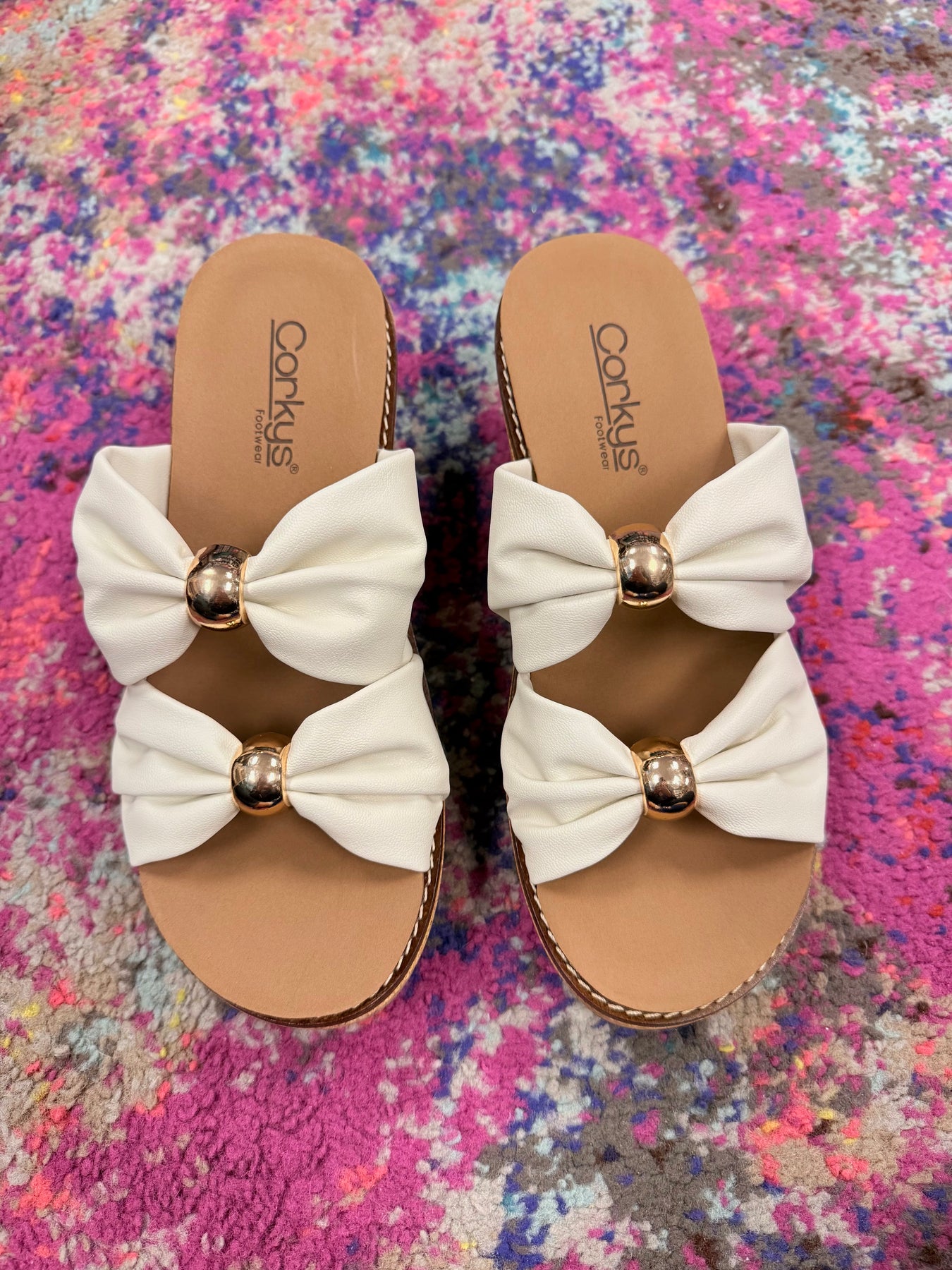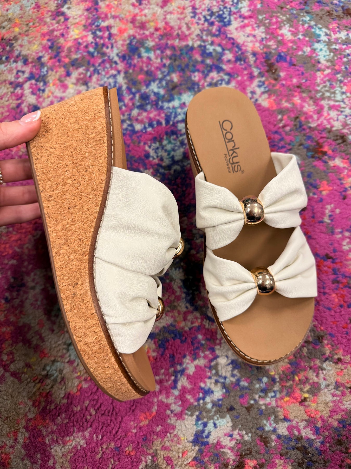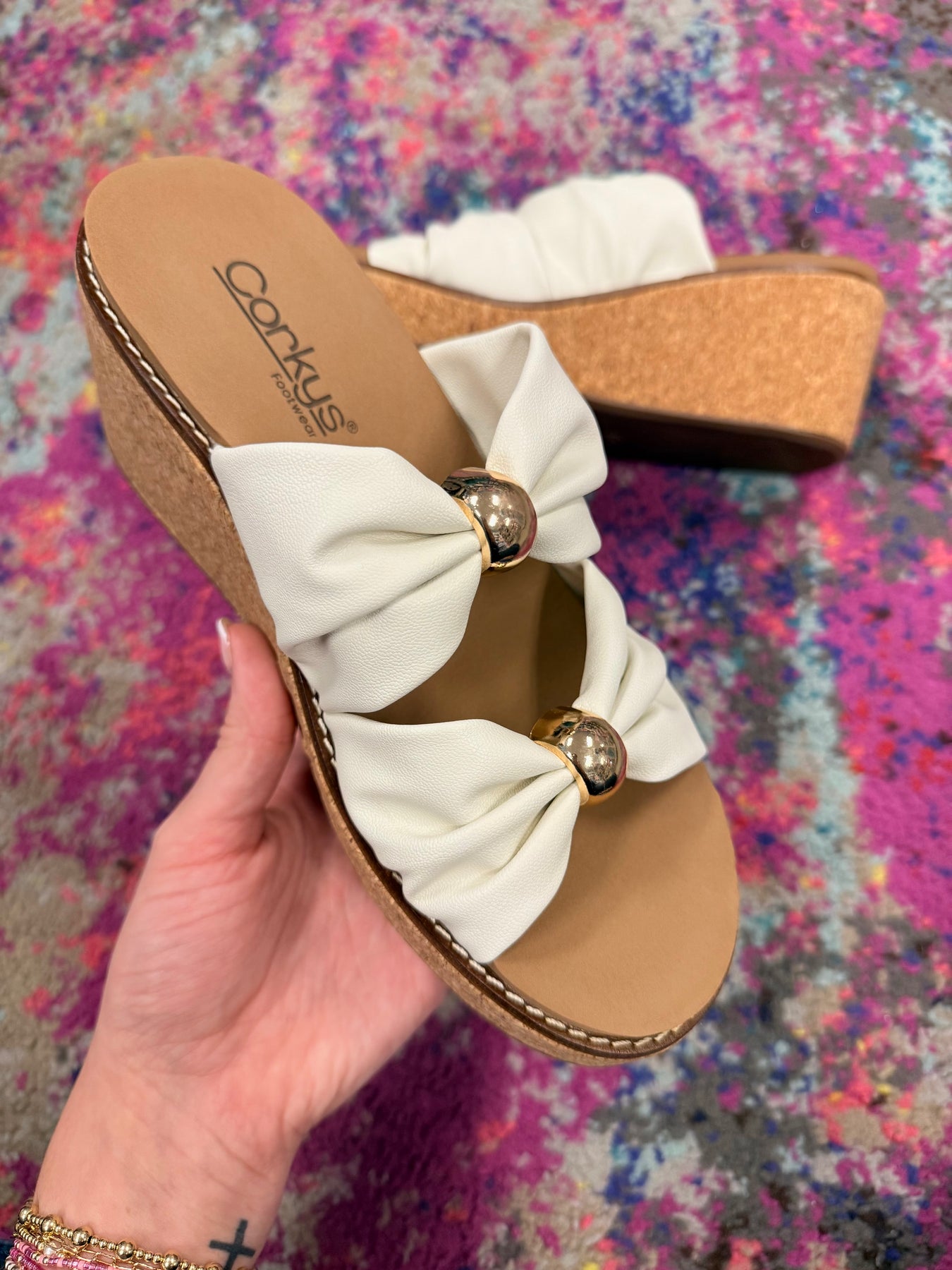 Step into effortless style with these Corky's Miss Understood Wedges in ivory. Featuring a faux leather upper adorned with shimmering gold details and a charming double bow design, these slip-on beauties make getting ready a breeze. The cushioned footbed keeps your feet happy all day, while the 3-inch cork heel adds just the right lift without the fuss. Finished with durable rubber soles, they're ready for whatever adventure comes your way.