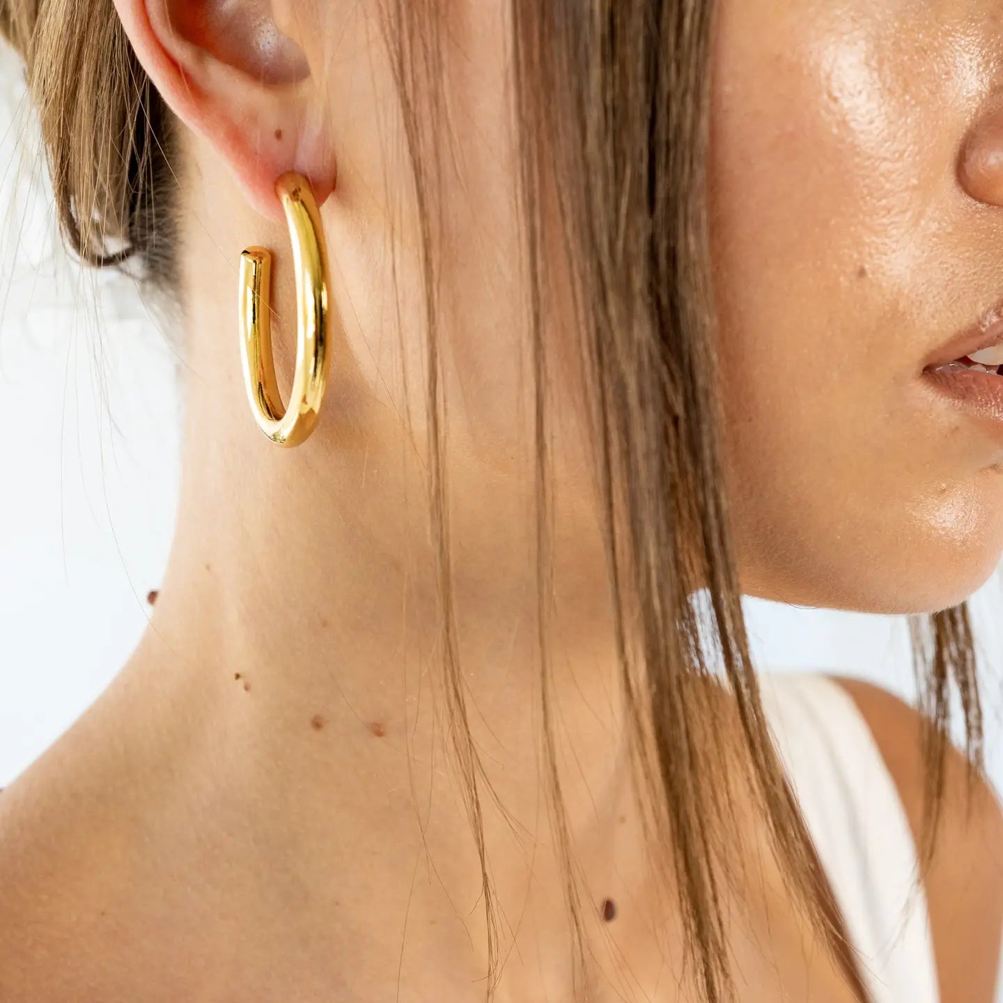 Your outfit is not complete without our Rina Hoops. An absolute must for your jewelry collection, featuring a gorgeous classic hoop with an 18k plated post.