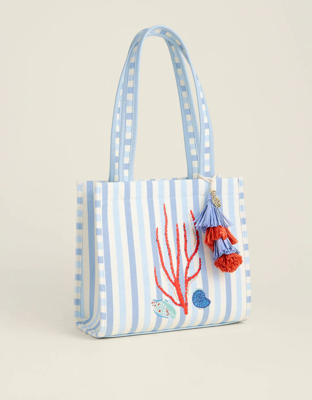 Gorgeous craftsmanship is all squared away in our Box Tote. Customers love the intricately embroidered sea life bringing luxe texture to this cotton canvas tote. The exterior features faux leather trimmed shoulder straps and a fun, straw tassel pom fob. The top unzips to a roomy interior with 2 stacked slip pockets and 1 zip pocket.