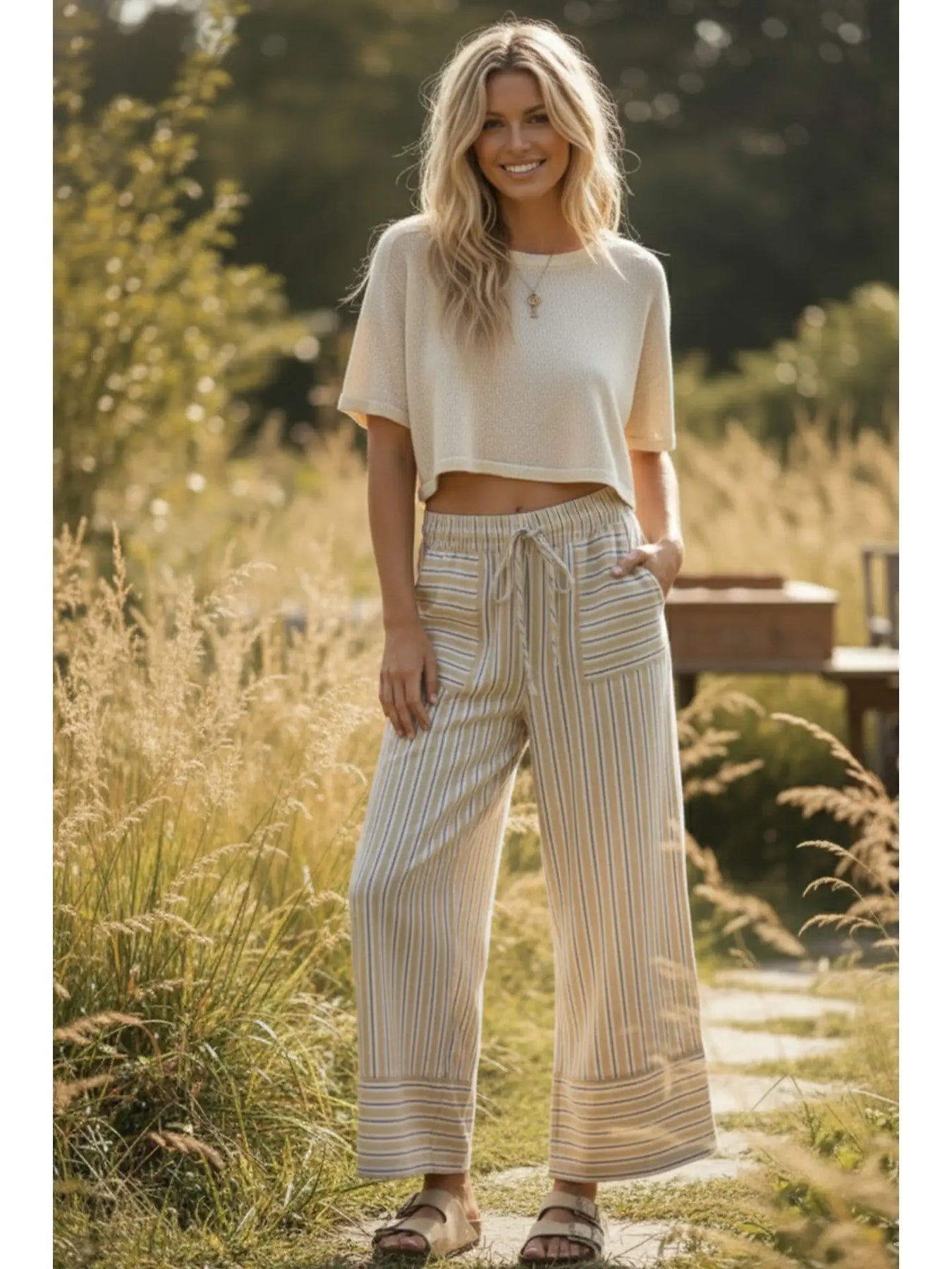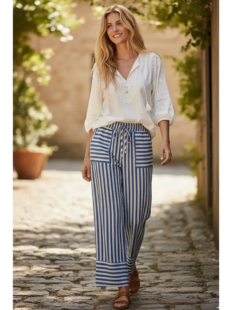 Lightweight and breezy woven striped pants featuring a relaxed wide-leg silhouette and drawstring waistband for an effortless fit. Designed with front patch pockets and a soft drape, these pants offer everyday comfort with an elevated, coastal-inspired look. Perfect for pairing with simple tops or boho blouses for a casual-chic style that transitions easily from brunch to beach strolls.