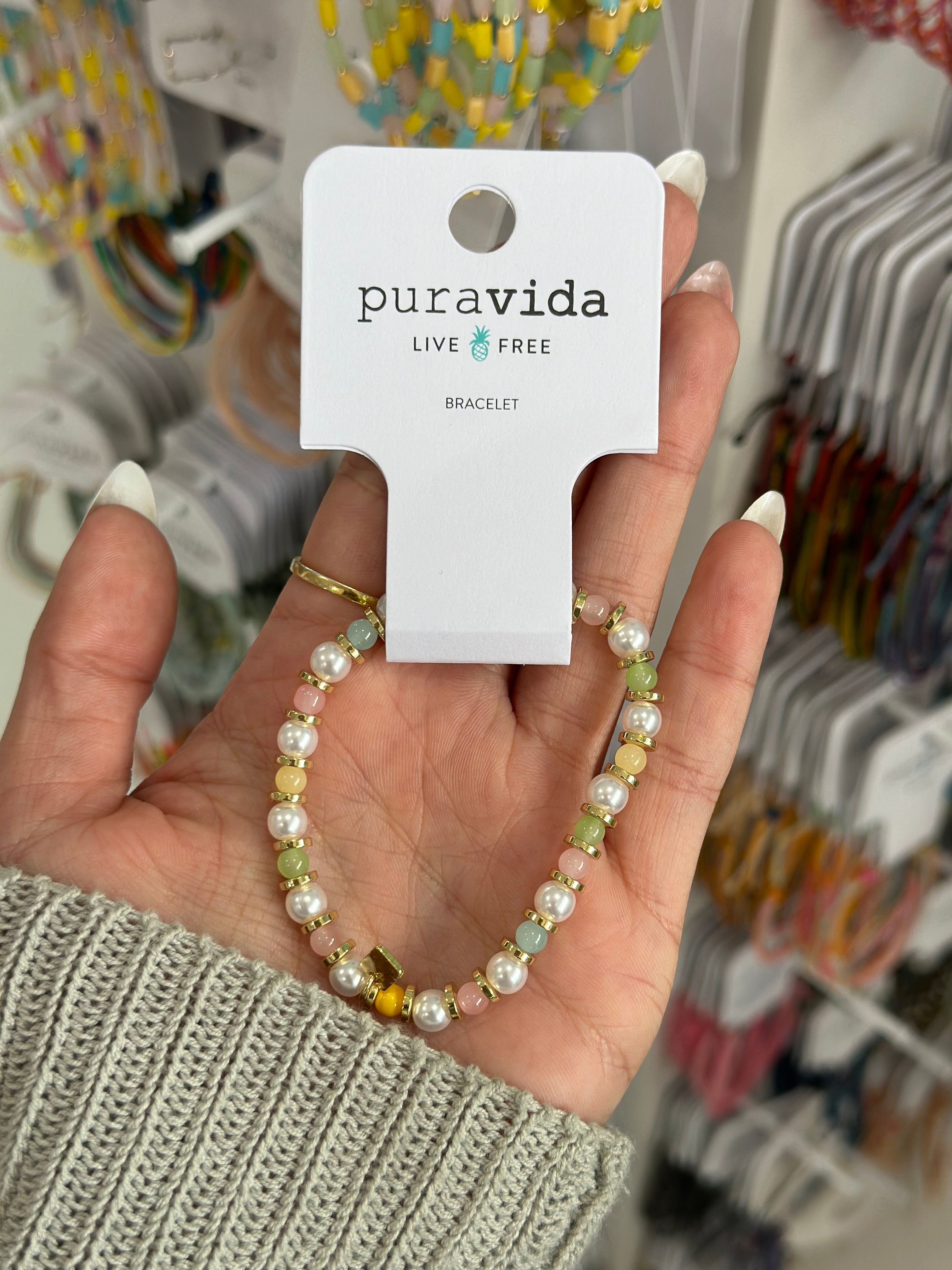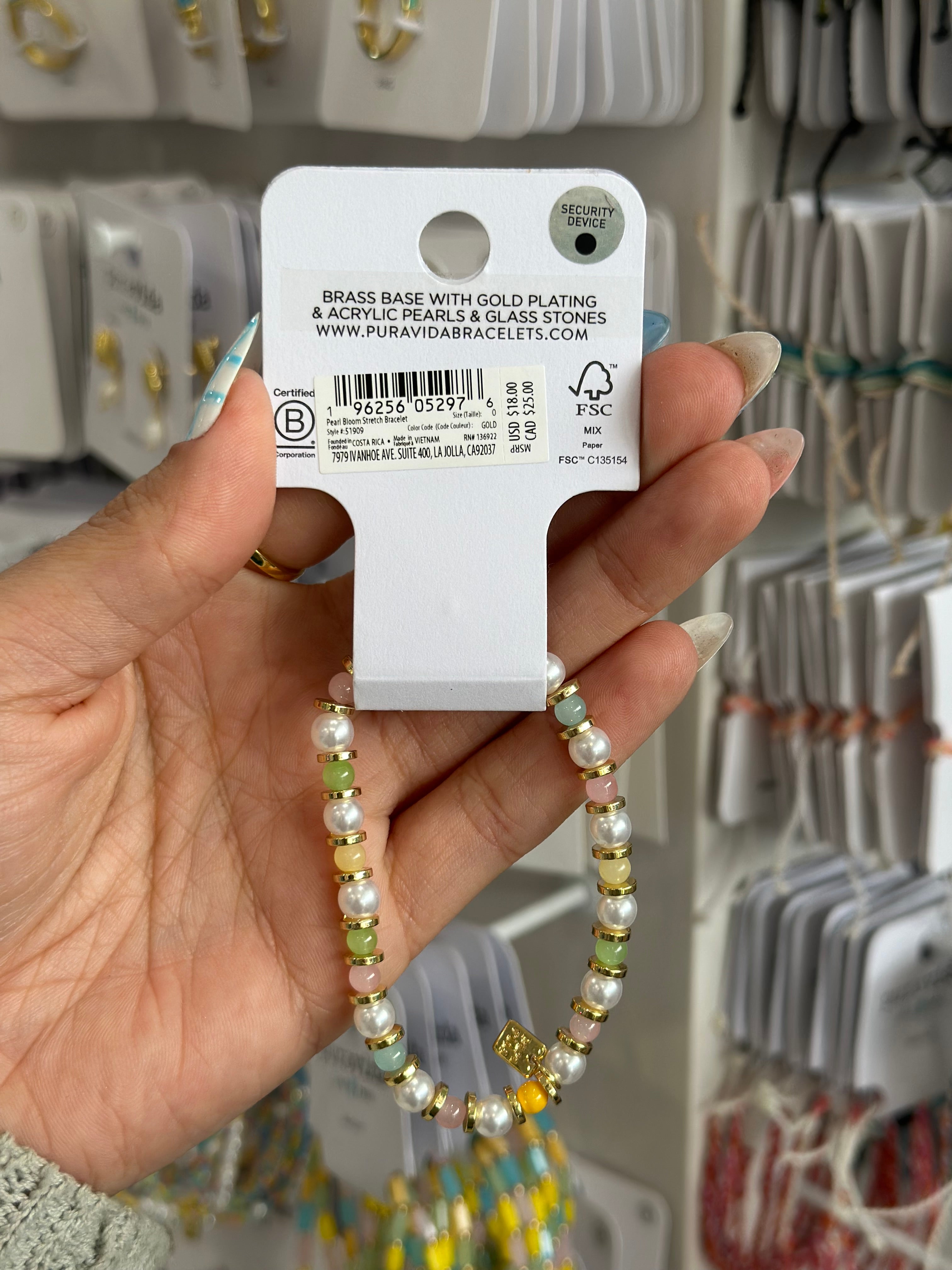 Expertly crafted with a brass base coated in gold plating, the Pura Vida Pearl Bloom Stretch Bracelet features stunning acrylic pearls and sparkling glass stones. Perfect for adding a touch of elegance to any outfit, this bracelet is a timeless and versatile accessory for any jewelry lover.