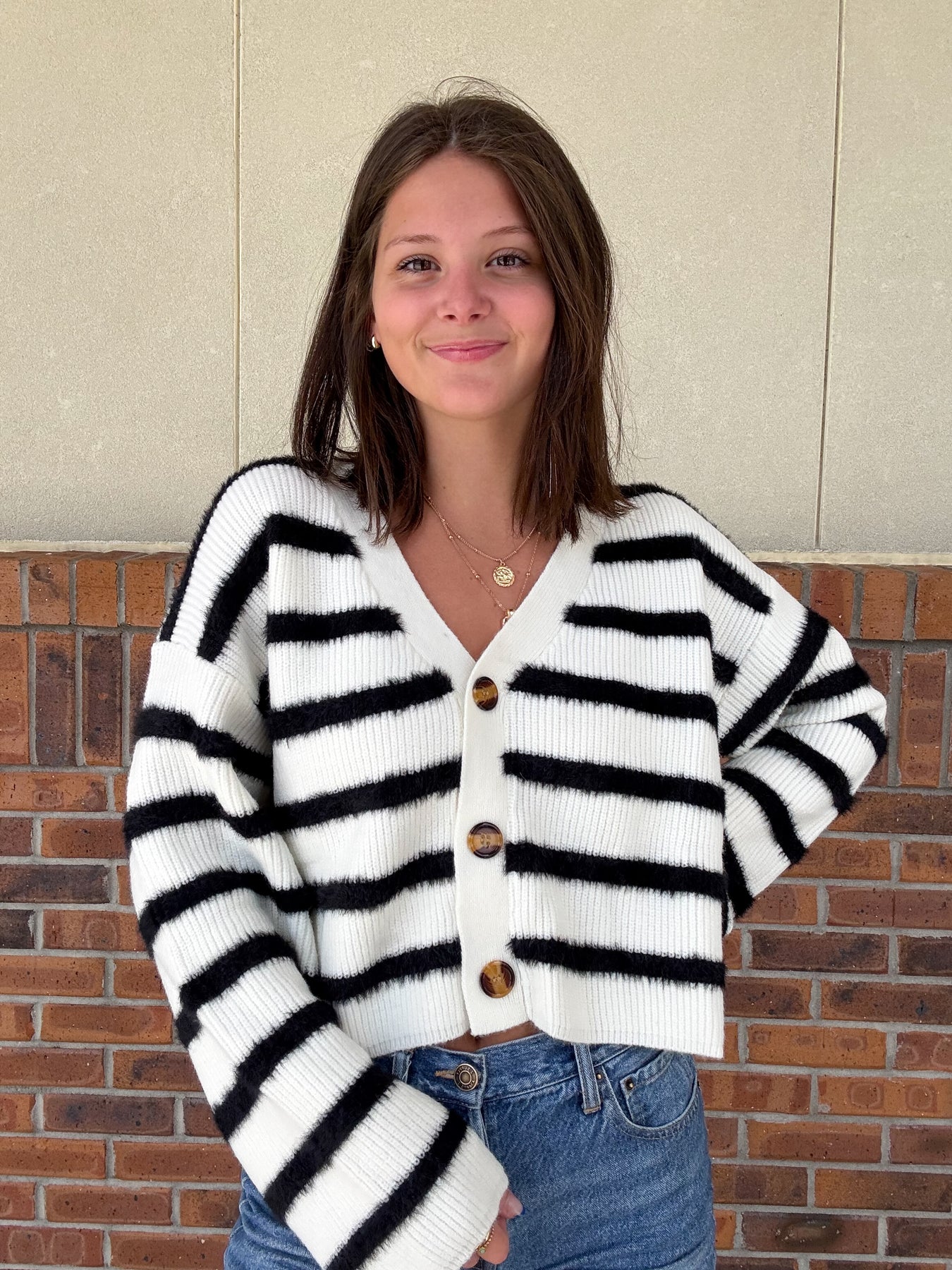 The Striped Button Front Long Sleeve Cardigan is a versatile and stylish wardrobe essential. Crafted from a soft and cozy fabric, this cardigan features a classic striped pattern that adds a touch of sophistication to any outfit. With its long sleeves and button-front design, it offers both comfort and easy layering options. Perfect for casual or semi-formal occasions, this cardigan pairs effortlessly with jeans, trousers, or skirts, making it a must-have piece for any fashion-forward individual seeking both comfort and style.