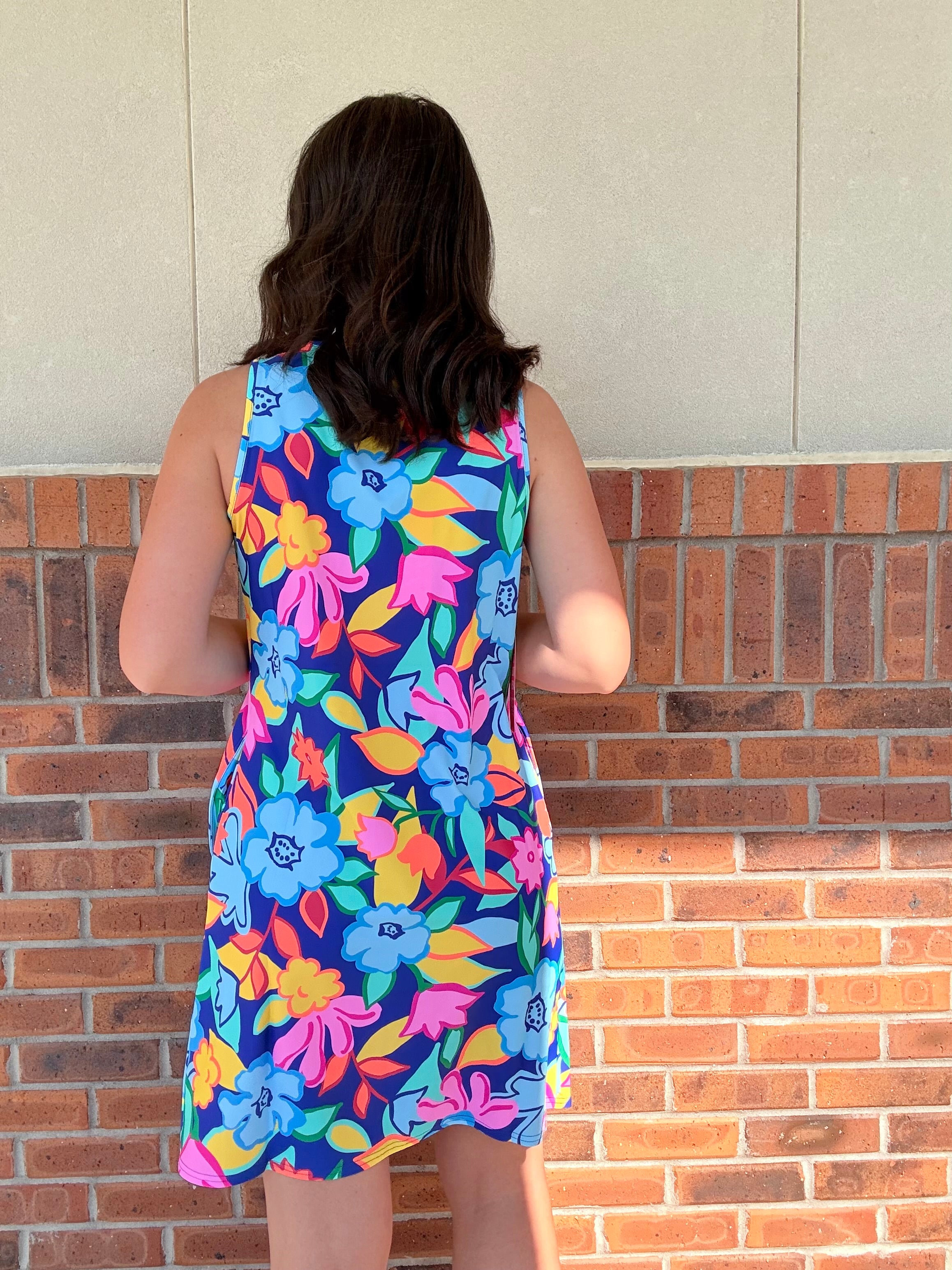 Escape to paradise with this vibrant sleeveless shift dress featuring a tropical floral print in shades of blue, pink, and yellow. The relaxed fit and side pockets offer comfort and convenience, while the charming tie detail at the neckline adds a touch of elegance. Perfect for resort getaways, beach vacations, or any occasion calling for effortless, sun-soaked style.