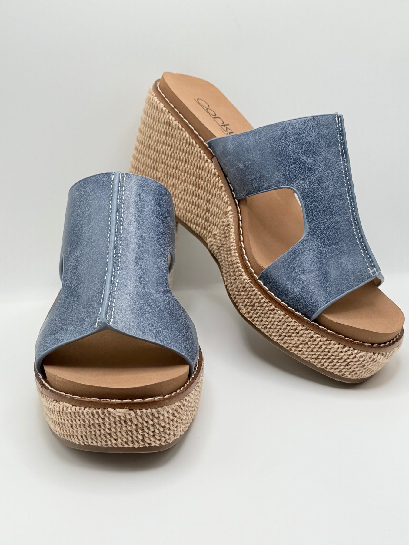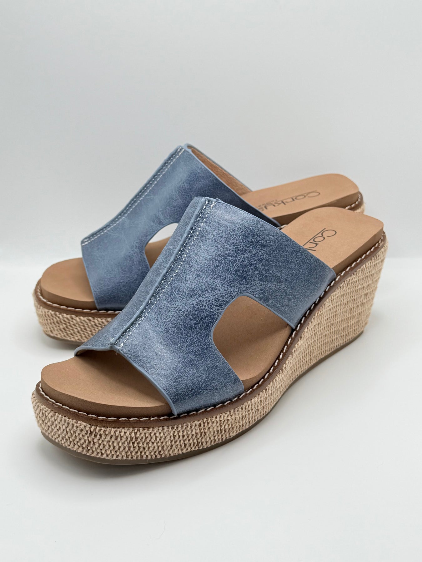 Step into coastal vibes with the Corkys Kiss N Tell Ocean—a stunning wedge that brings beachy charm to every outfit. Inspired by oceanic blues and finished with a textured raffia heel, this 2.5" wedge offers the perfect lift without sacrificing comfort. Whether you're heading to the shore or just channeling that breezy, sun-kissed energy, this playful pair delivers style that makes a splash.