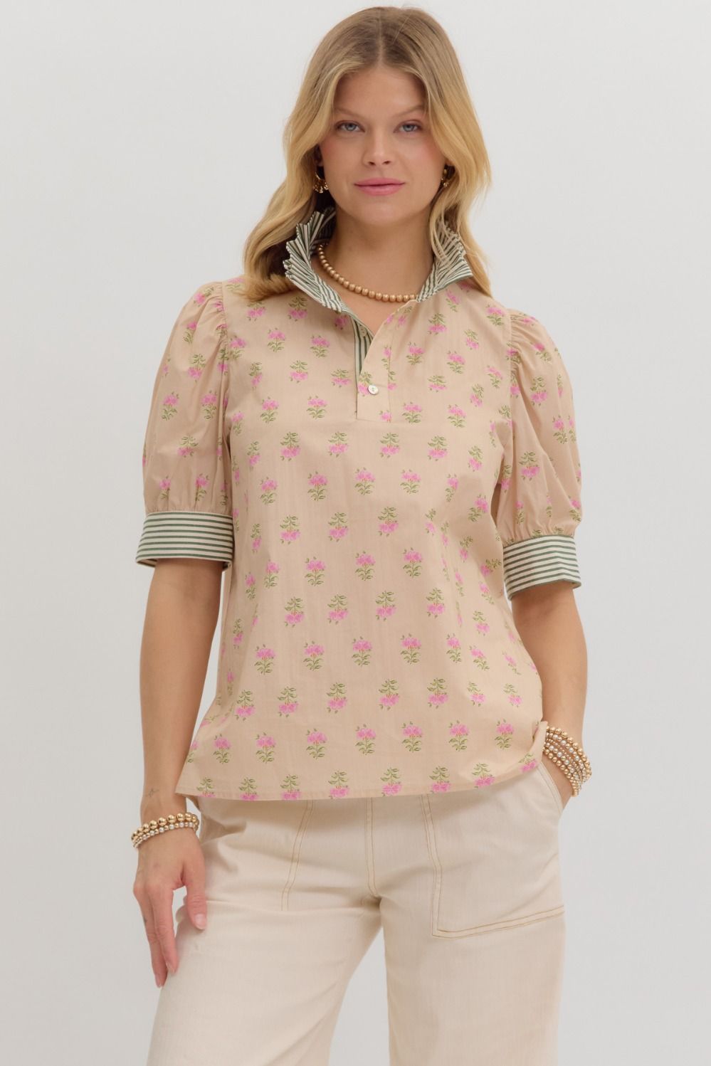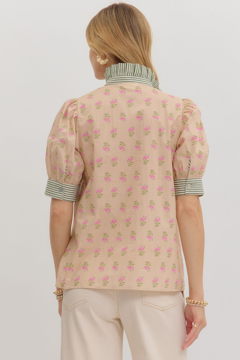 This playful floral pattern blouse brings a fresh burst of charm with its vibrant cuff band and contrasting striped accent. Crafted from lightweight, breathable 100% cotton, it’s perfect for sunny days and casual outings. The short sleeves and woven fabric keep you comfortable and stylish without any lining or sheerness. Add a fun twist to your wardrobe with this easygoing, eye-catching top!