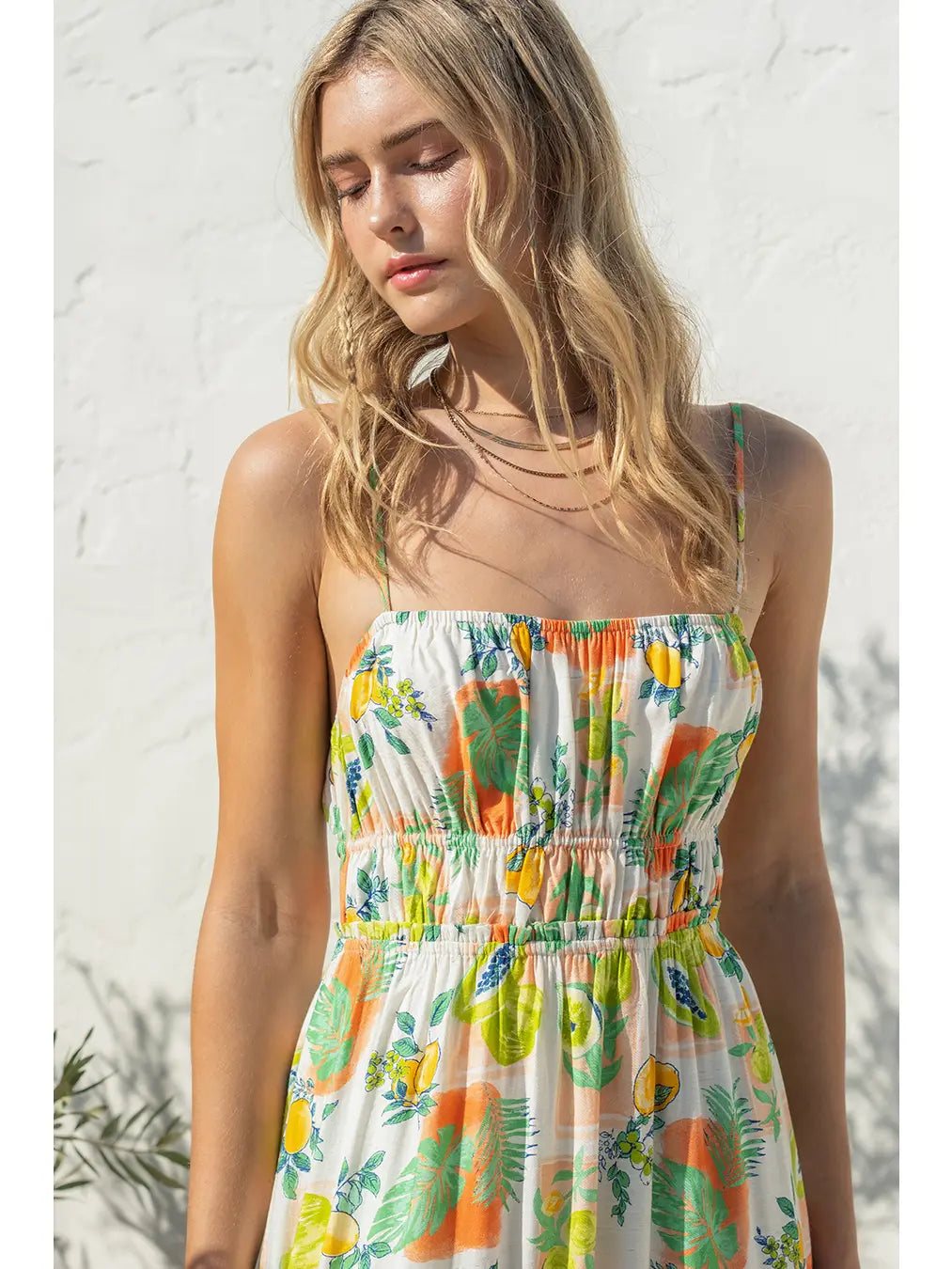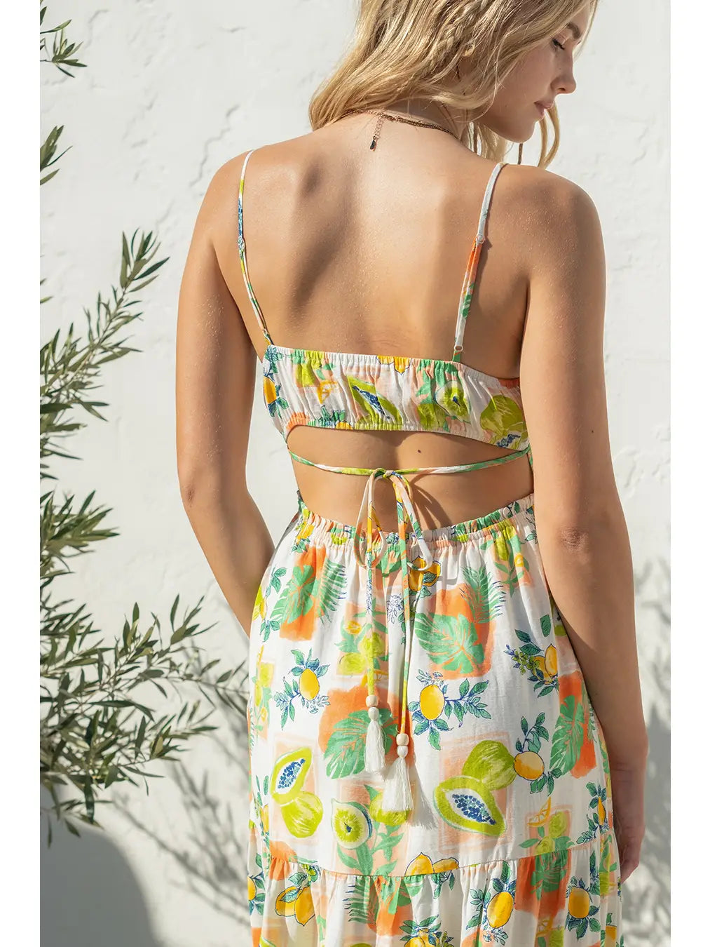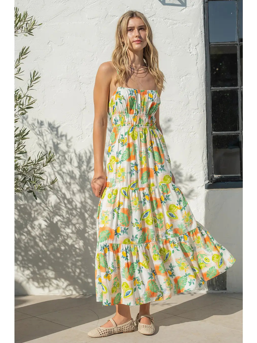 Gwyneth Maxi Dress Turn heads in this printed maxi that's equal parts flirty and fabulous. The sleeveless silhouette features adjustable shoulder straps for a custom fit, while the elastic waistband keeps you comfy all day long. Tier ruffles cascade down the skirt for movement and drama, and the cutout back adds just the right amount of sass. A tie-back detail cinches the look, and the lined interior ensures you're covered. Perfect for everything from beach days to evening adventures.
