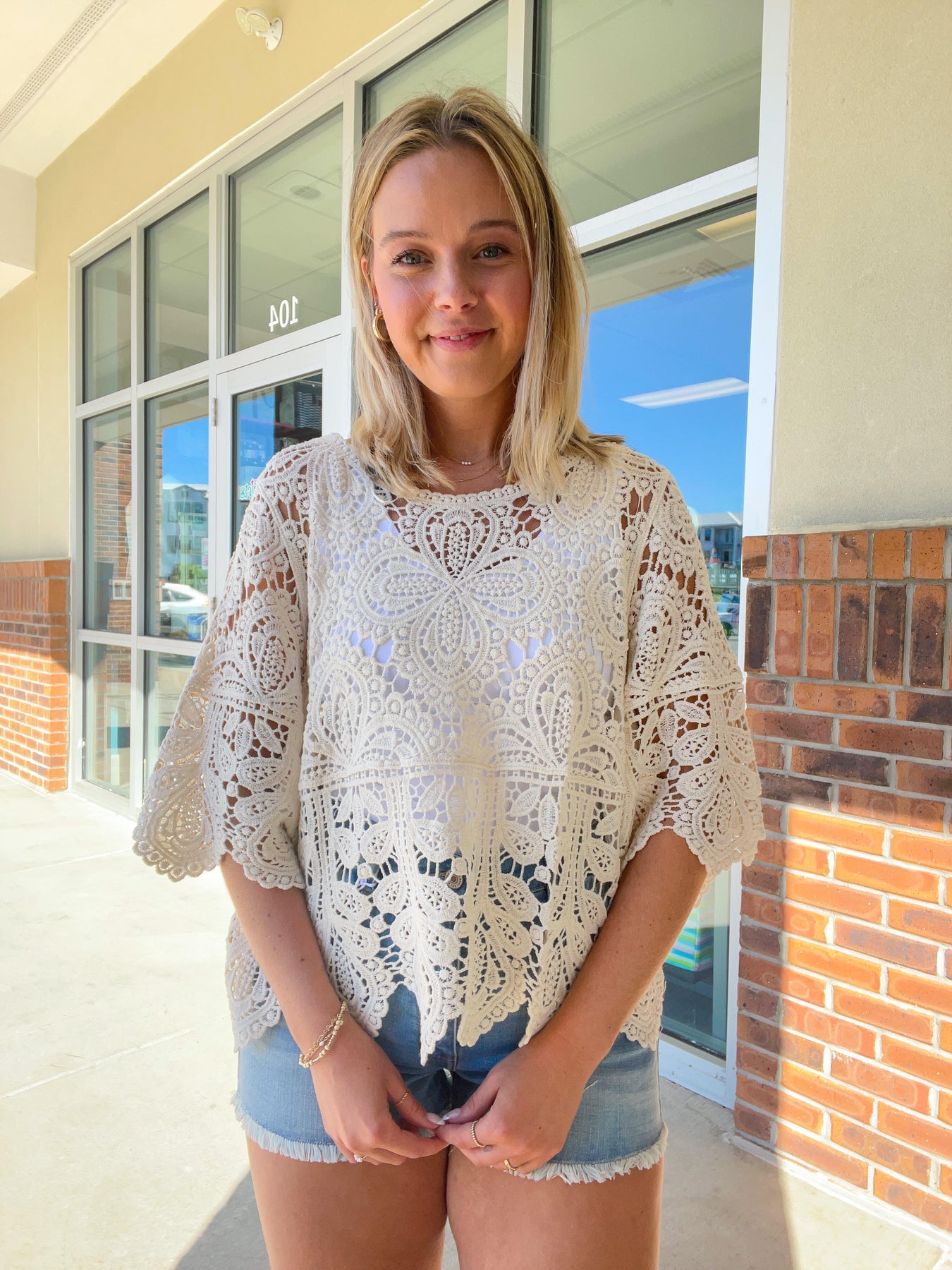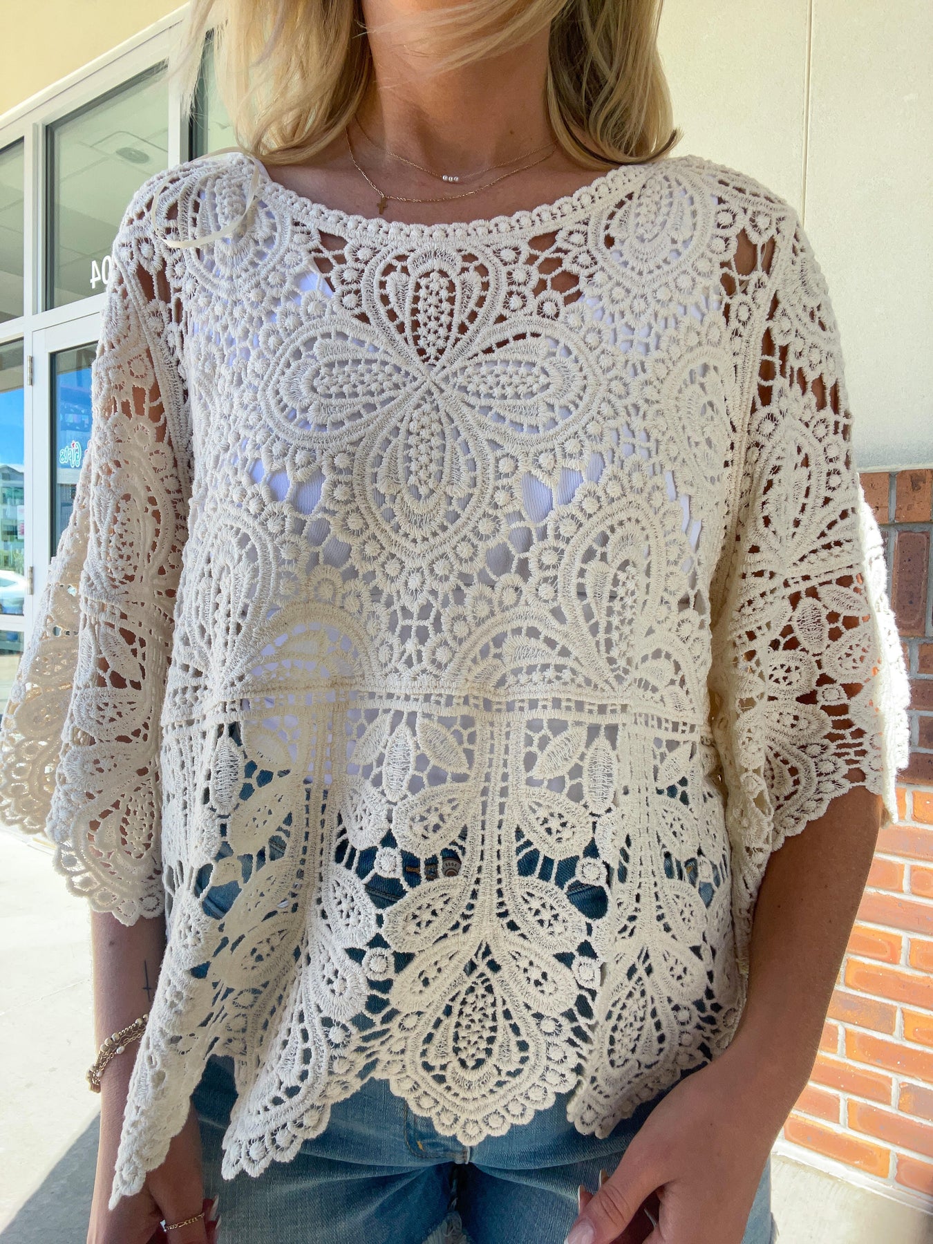 An open-knit crochet lace top featuring a scoop neck, 3/4 wide bell sleeves, oversized fit. Wear yours over a bathing suit as a cover-up or pair it with a tank underneath.