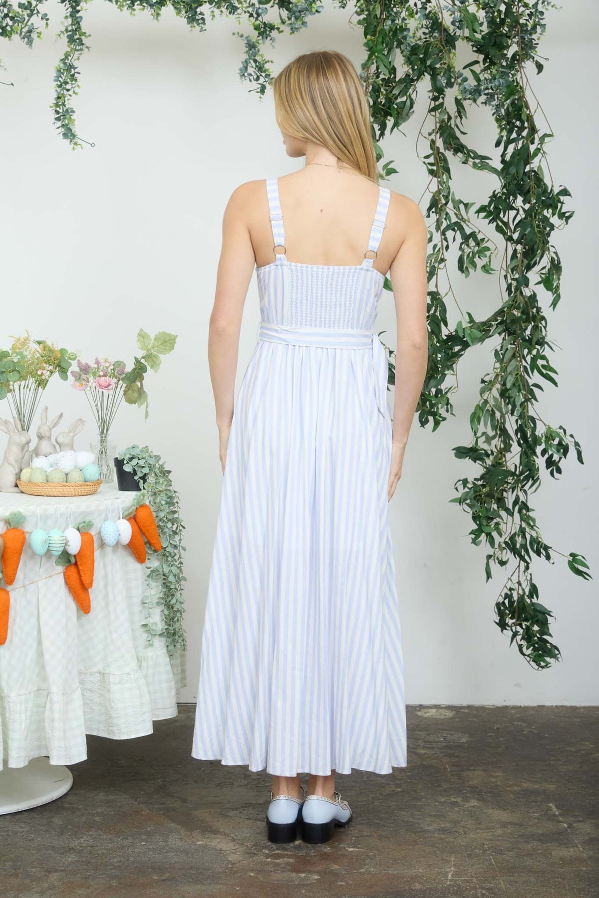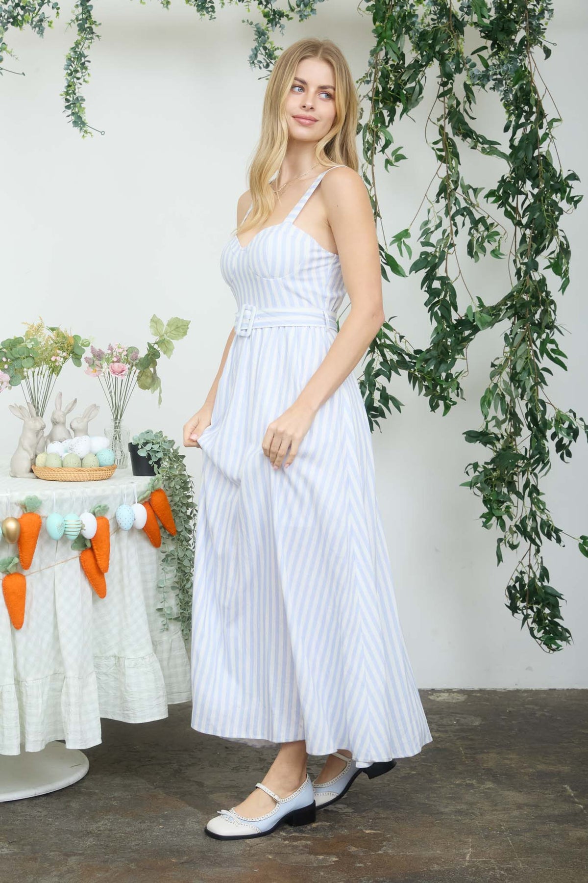 Embrace nautical elegance with the Sailor's Siren Midi Dress, featuring a flattering sweetheart neckline and sleeveless design. The adjustable spaghetti straps and structured corset bodice provide a refined silhouette, while back smocking adds subtle texture and movement. An elastic waist with belt loops lets you customize the fit with your favorite belt. Crafted from a breathable rayon, linen, and cotton blend with a linen stripe pattern, this midi dress is fully lined for comfort. Perfect for coastal getaways or effortless weekend style.