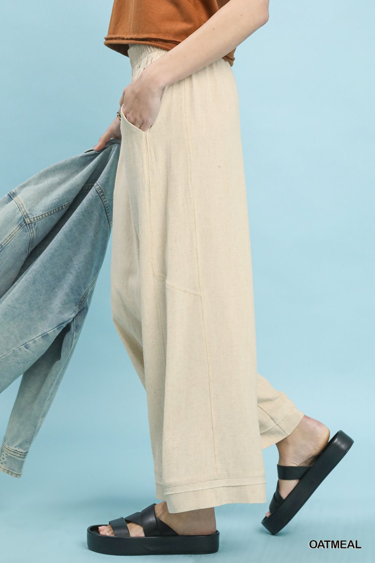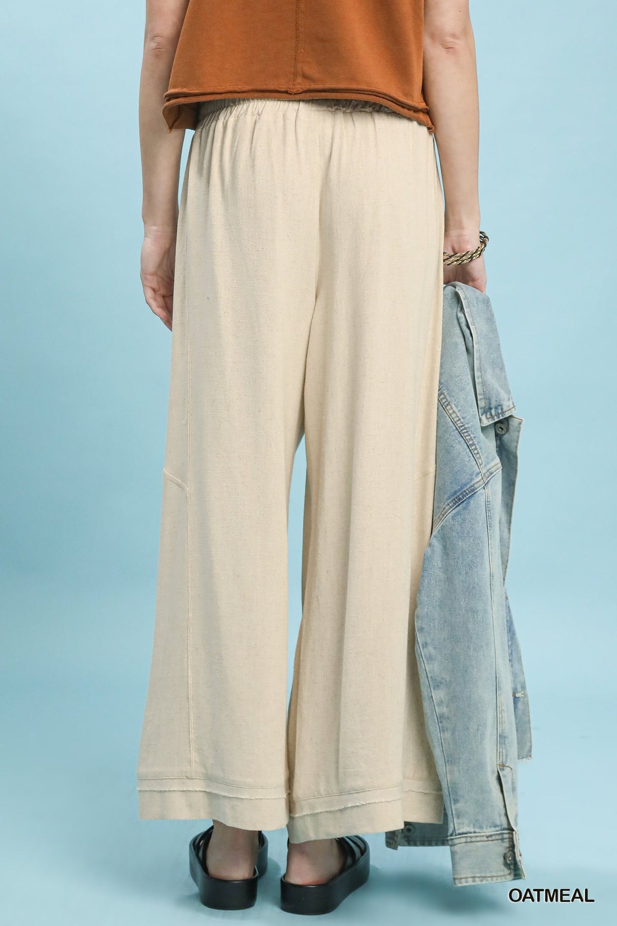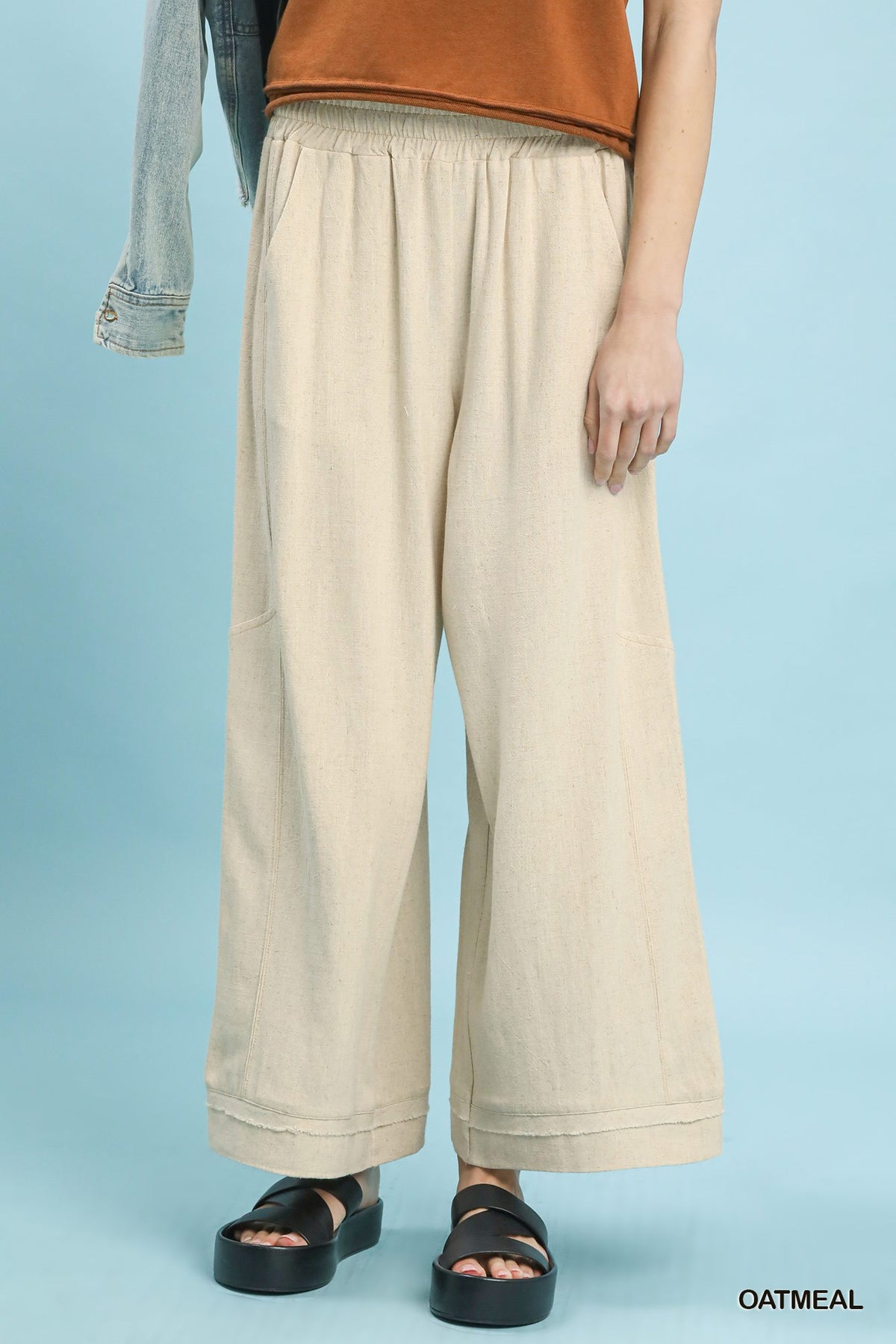 Effortless comfort meets laid-back style with these Umgee Dahlia linen pants. Crafted from breathable linen, they feature a relaxed wide-leg cut and elastic waistband for all-day ease. Practical side pockets keep your essentials close, while contrast stitching adds a subtle design detail. Unlined for maximum breathability—perfect for warm weather adventures or casual everyday wear.